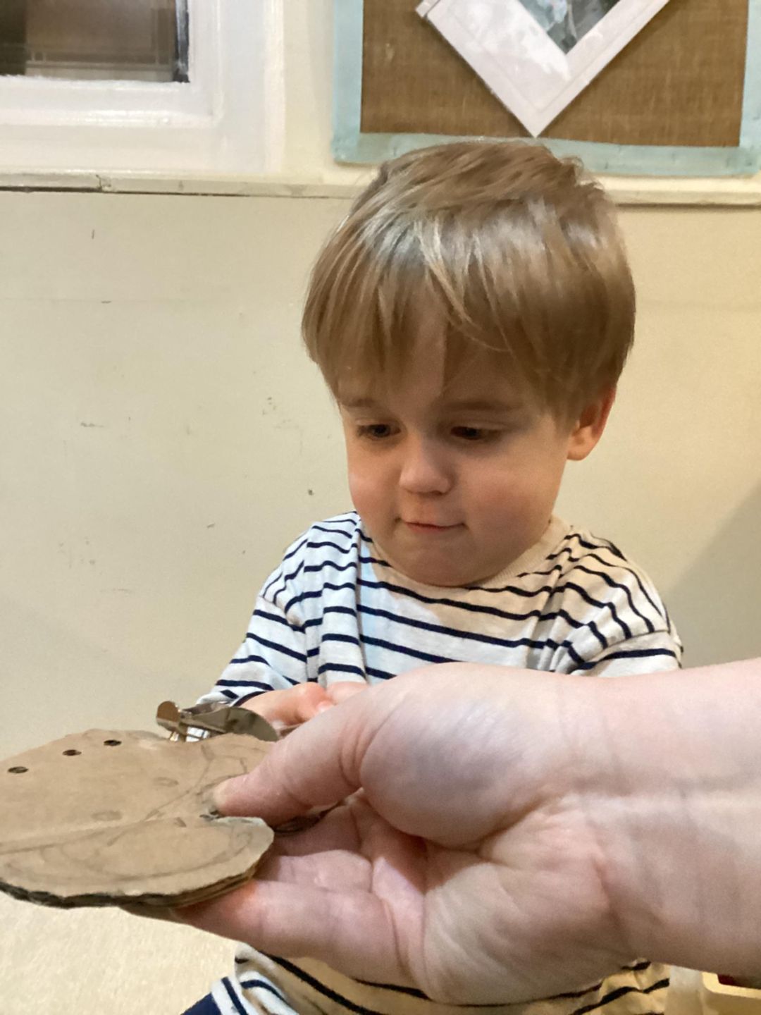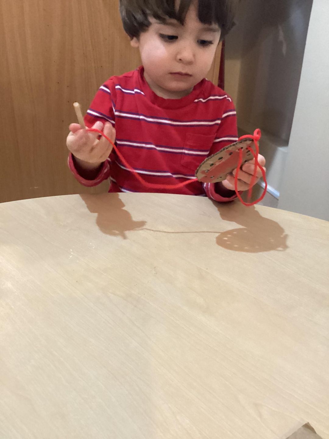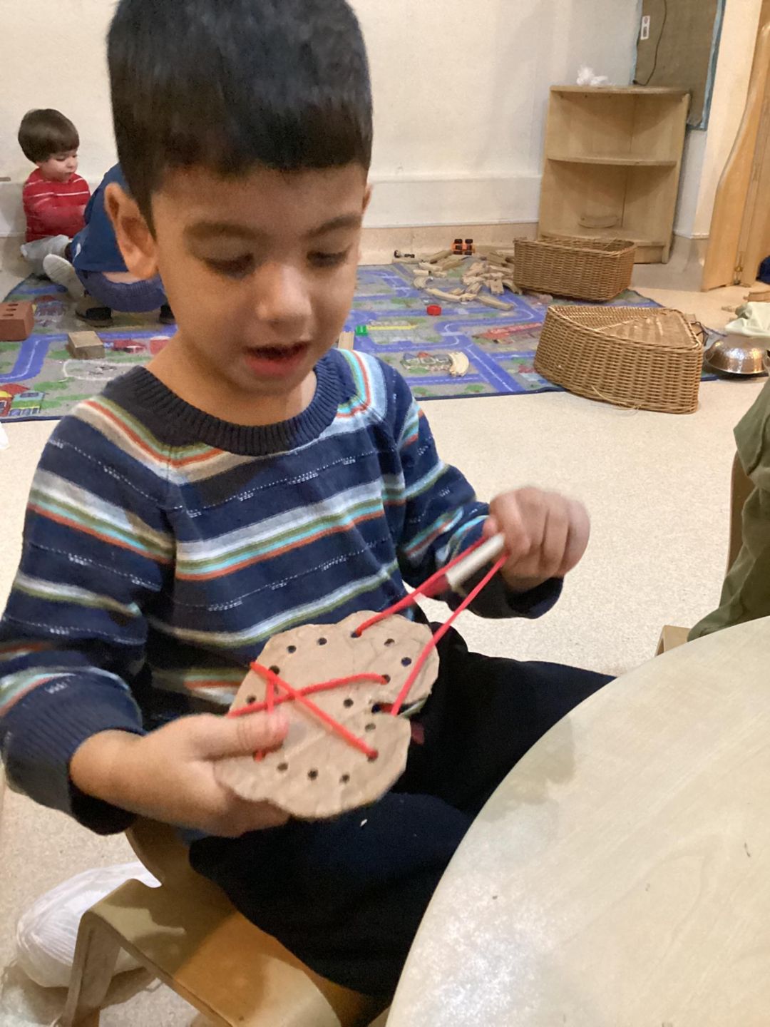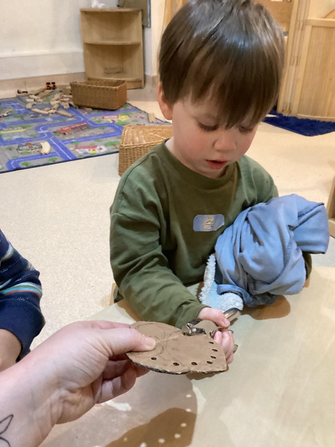This week, the grasshoppers had a fantastic time exploring the concept of recycling. They engaged in risky play by assisting their teachers in creating their own threading boards. The children participated actively by selecting the shapes for their boards and using scissors to cut them out. This activity fostered their fine motor skills and hand-eye coordination as they carefully cut around the shapes, trying to stay within the lines. Some children required a bit of guidance and support to keep the board steady and to follow the lines, but everyone enjoyed taking a turn. After completing the shapes, the children used a hole punch to make holes around the boards, ensuring to hold the hole punch steady while their teachers assisted them. Once all the boards were finished, the children had immense fun using them for threading activities. They experimented with various threading tools, with some opting for a small slim wooden threading needle, while others chose thin plastic needles.