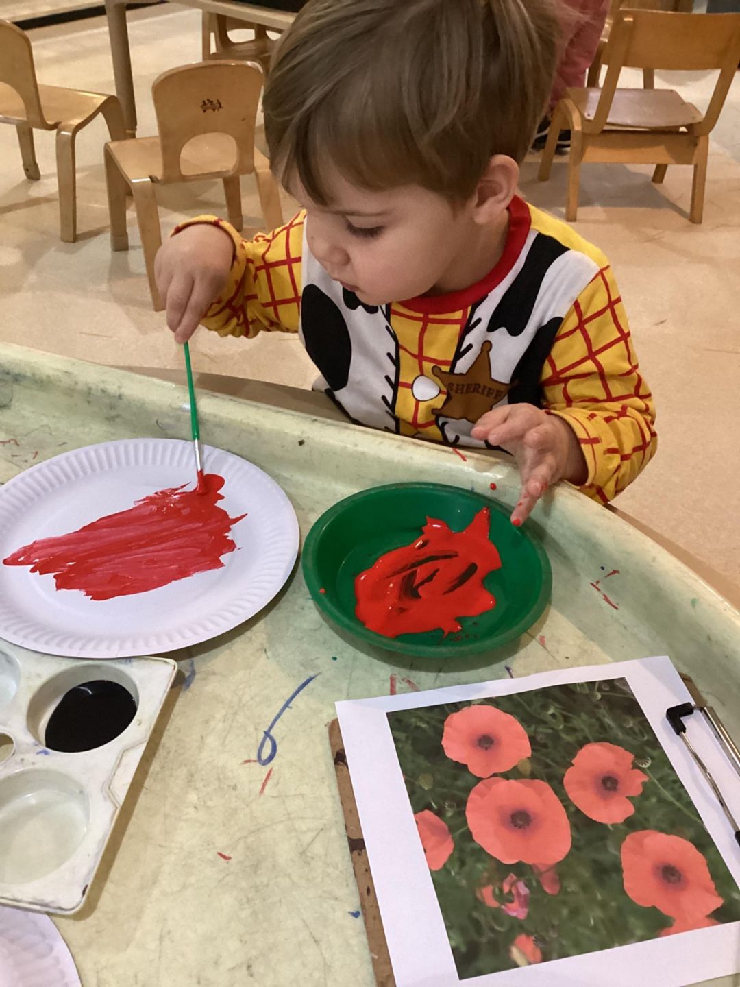 The children took part in various activities in order for Remembrance Day, they read stories and learnt about the poppy flower. The ladybirds used red and black paint and used their hands to decorate their poppies. The Ladybirds used their hands to make marks and explore, before placing them altogether to make their wreaths. The Butterflies children used a variety of tools to make their poppies. They used cotton buds and paintbrushes and paper plates to design their poppies. The Grasshopper children explored some risky play but using the child safety knives to cut the apples. Then then dipped their apples in paint and used the apples to make marks. When all of the wreaths were complete, the children went on a trip to the local Remembrance Day memorial to place their wreaths.