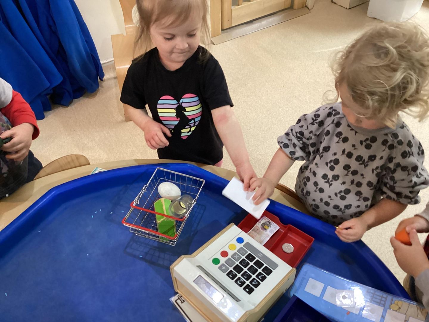 The math activity of the day, was shop role play! The children enjoyed choosing the item the wanted to buy and giving the cashier money to pay for them!