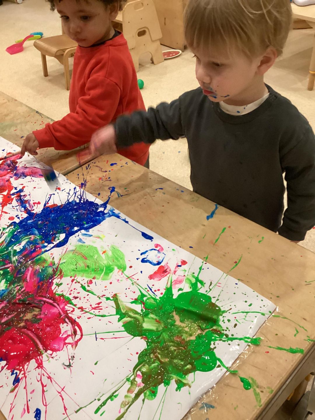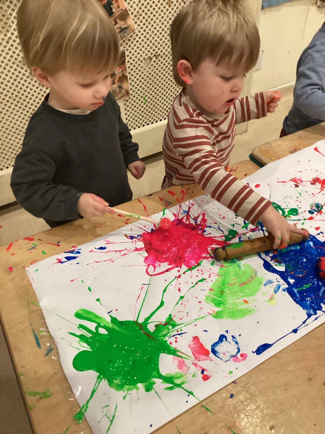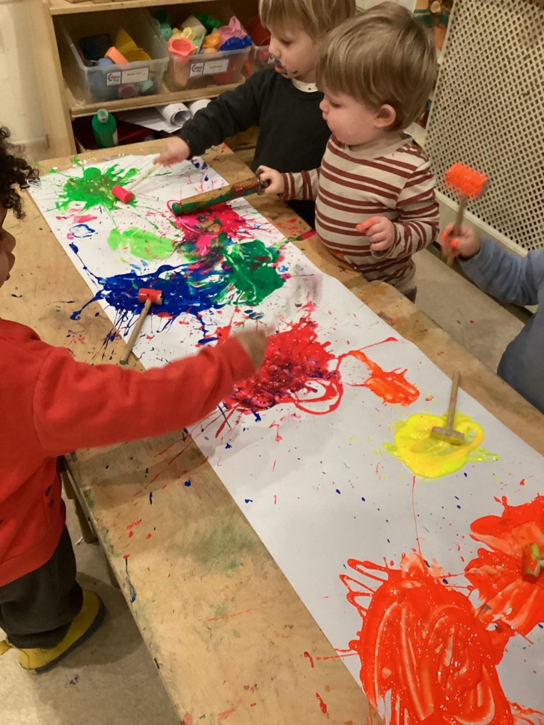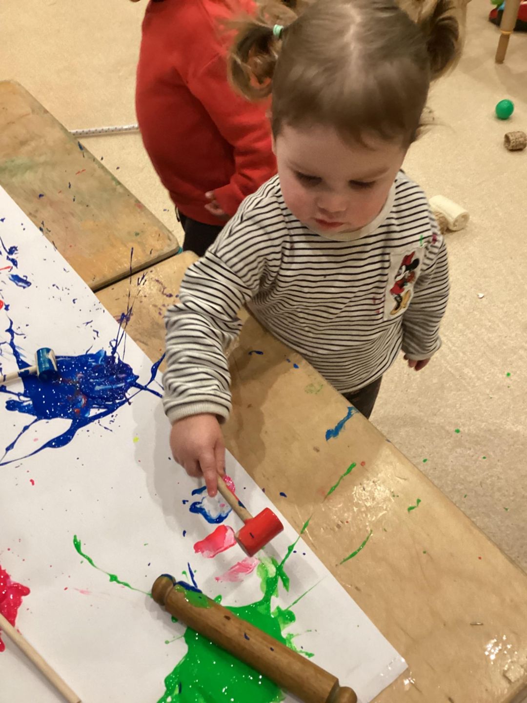 The children used small wooden mallets in a palmer grasp to splat paint onto the paper.