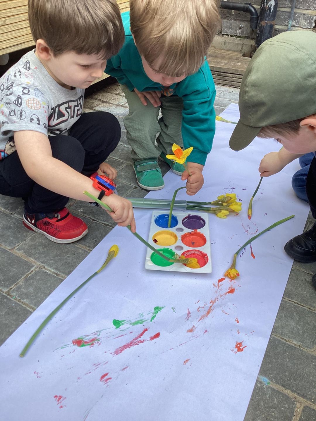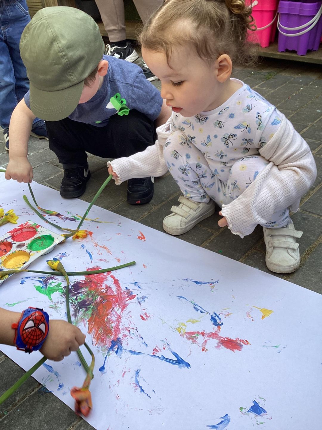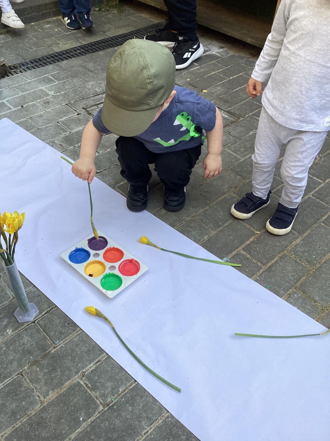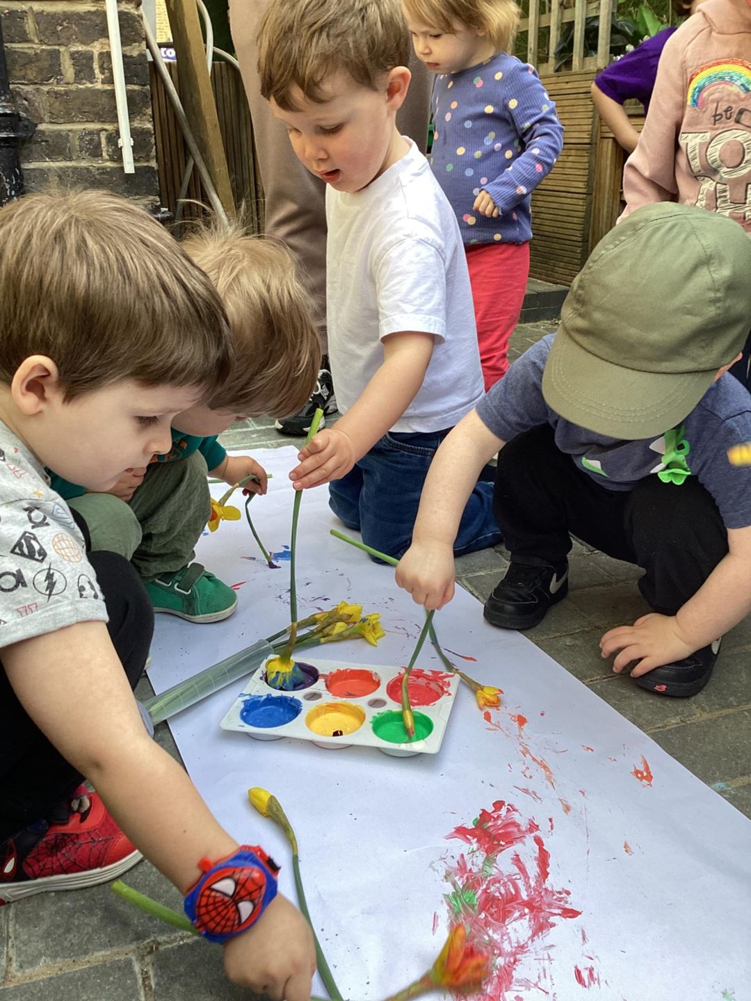 The Grasshoppers enjoyed creating a spring-themed painting inspired by daffodils and bright seasonal colours. As they explored their creativity, they also developed their fine motor skills by carefully holding the flower stems, practising both pincer and palm grips. This hands-on activity supported their control and coordination, helping to build the foundations needed for more precise movements, such as drawing.