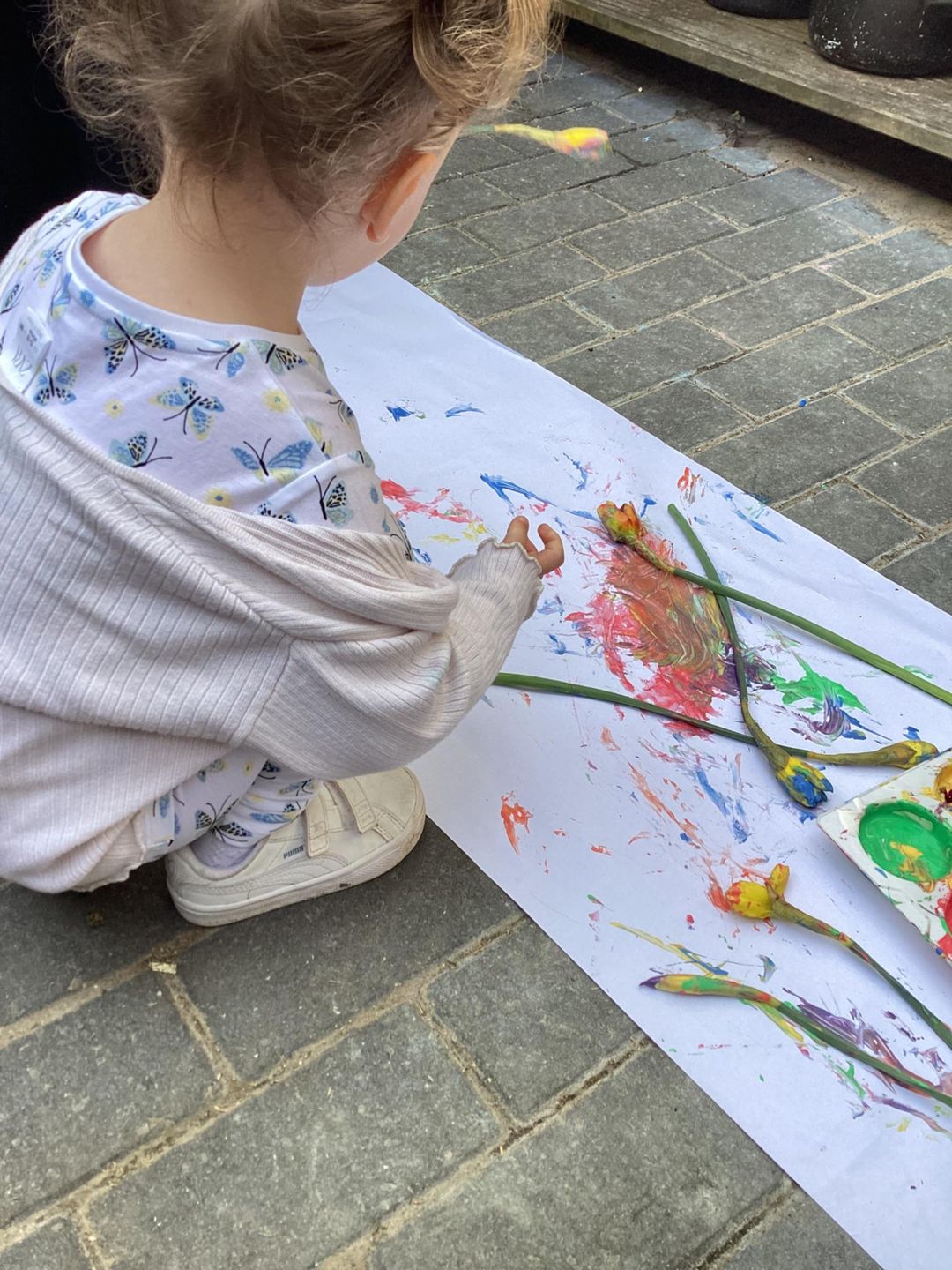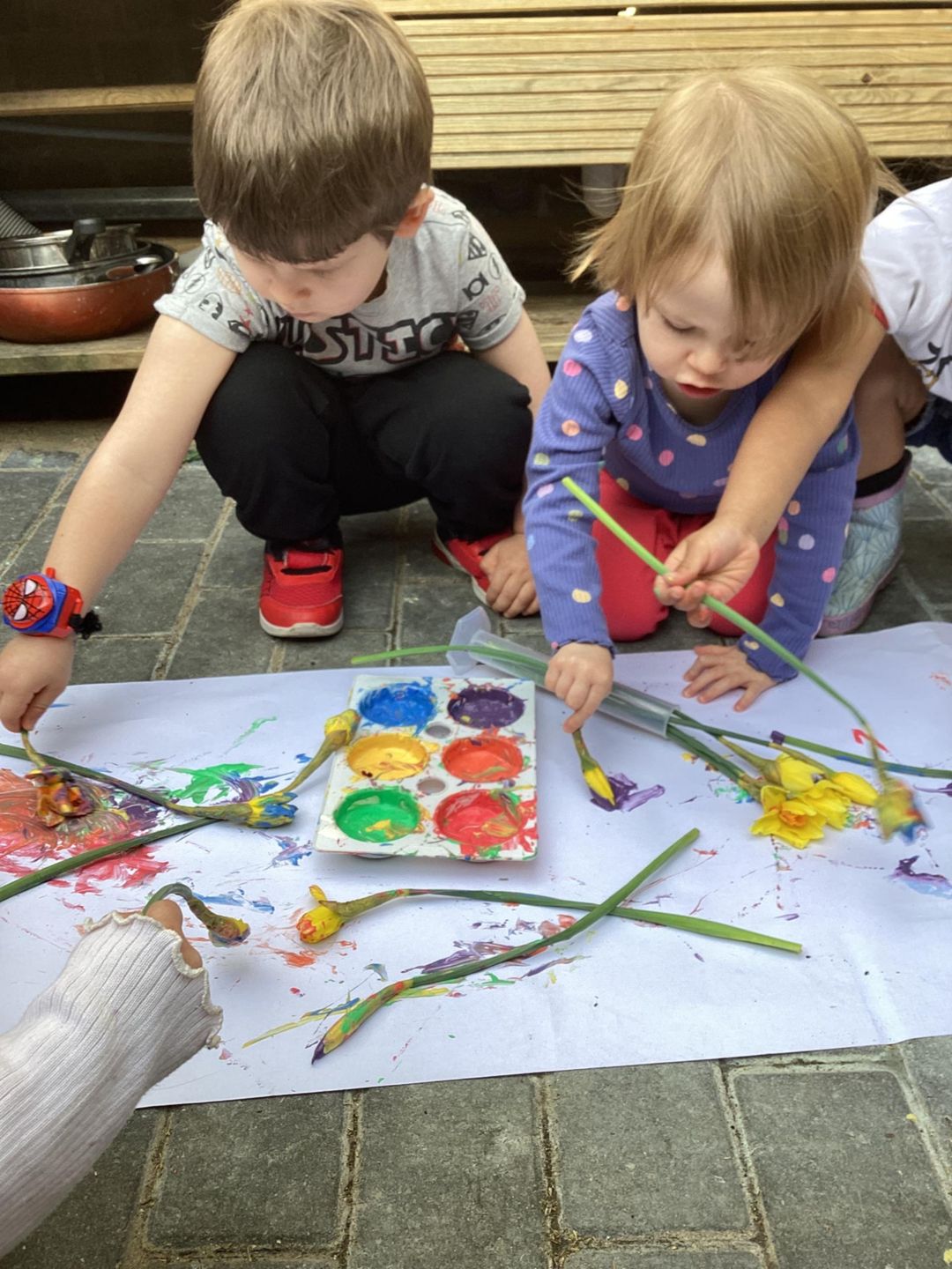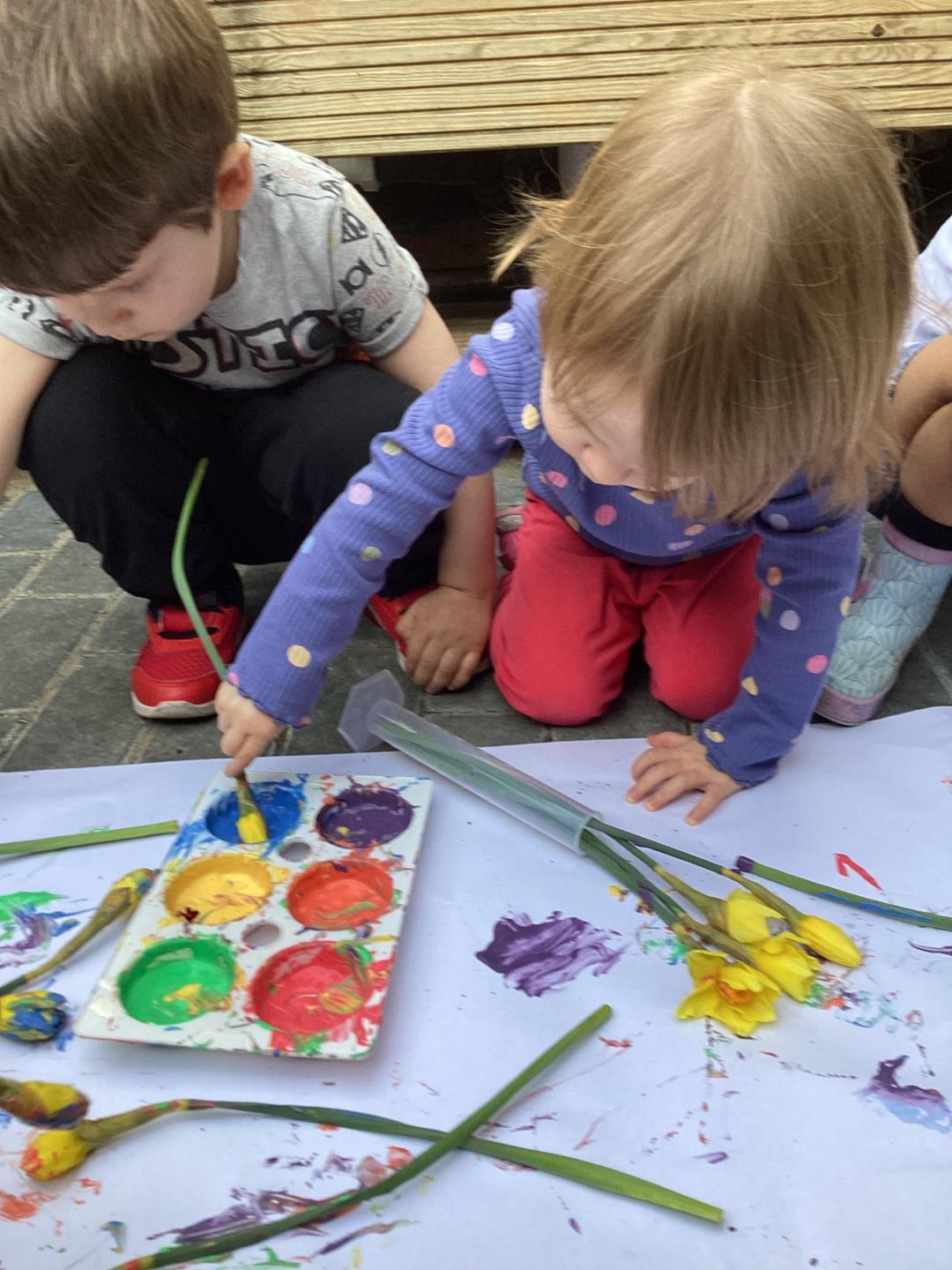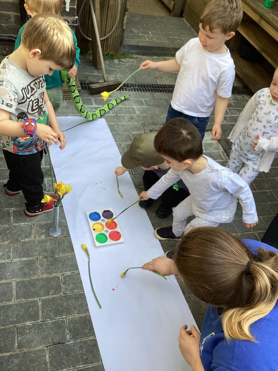 The Grasshoppers enjoyed creating a spring-themed painting inspired by daffodils and bright seasonal colours. As they explored their creativity, they also developed their fine motor skills by carefully holding the flower stems, practising both pincer and palm grips. This hands-on activity supported their control and coordination, helping to build the foundations needed for more precise movements, such as drawing.
