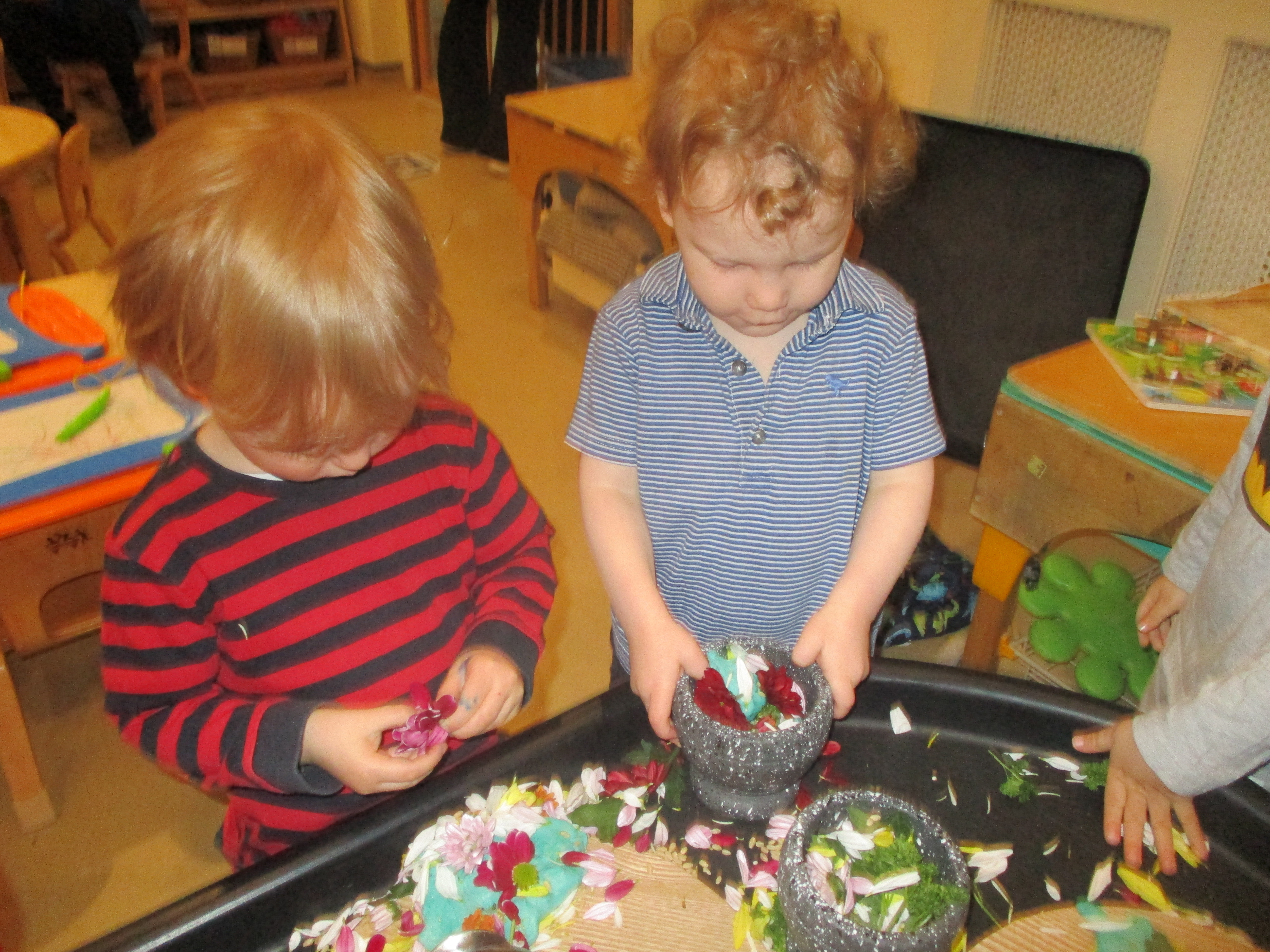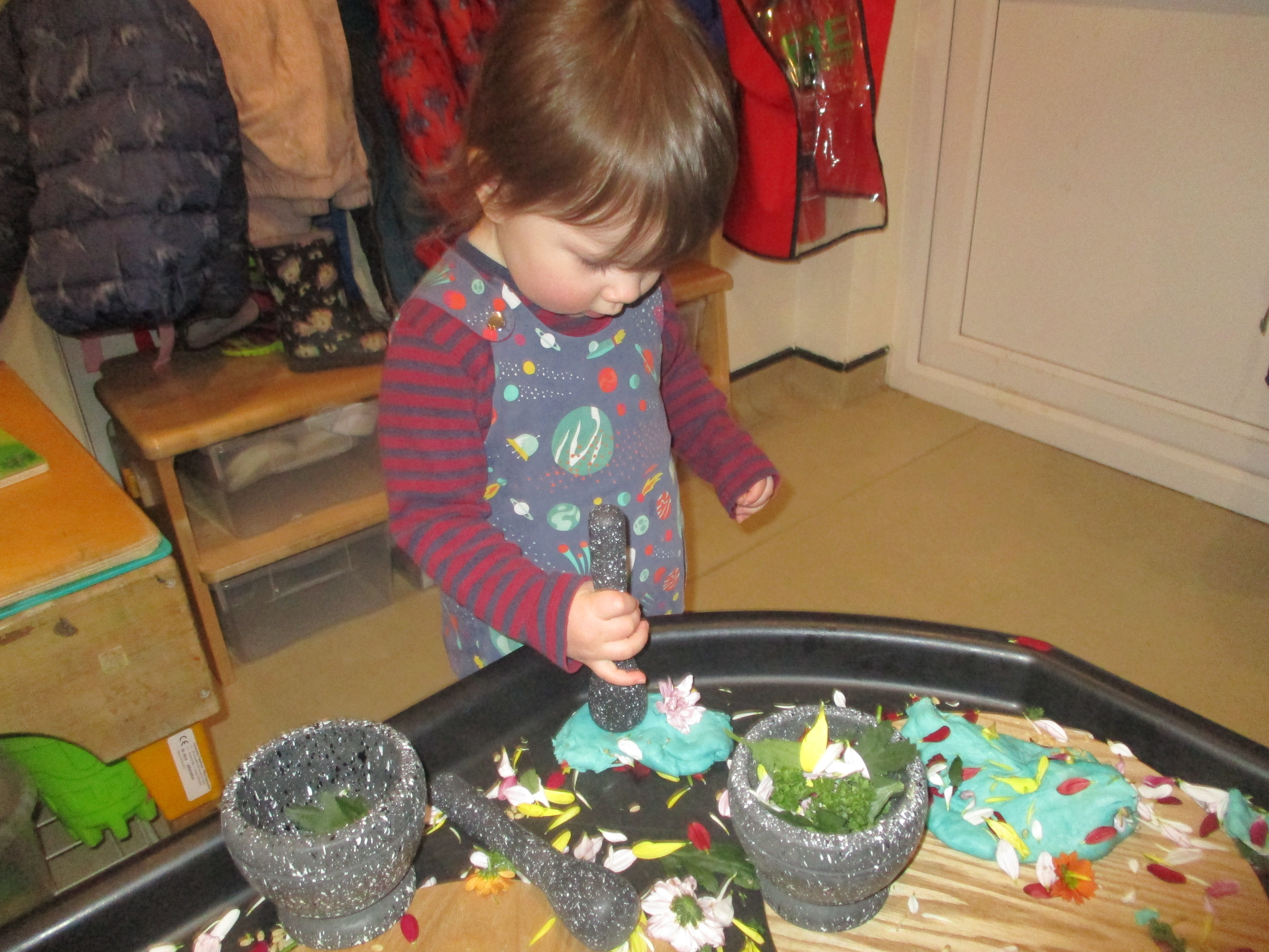 Flowers were added to pestle and mortars and the children crushed the flowers and smelt the mixture commenting on the smell.