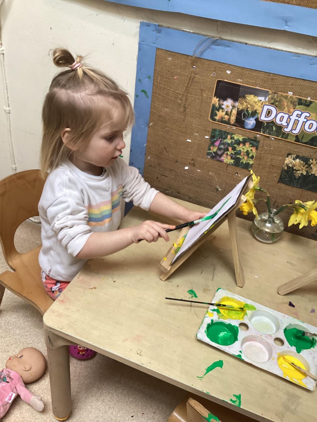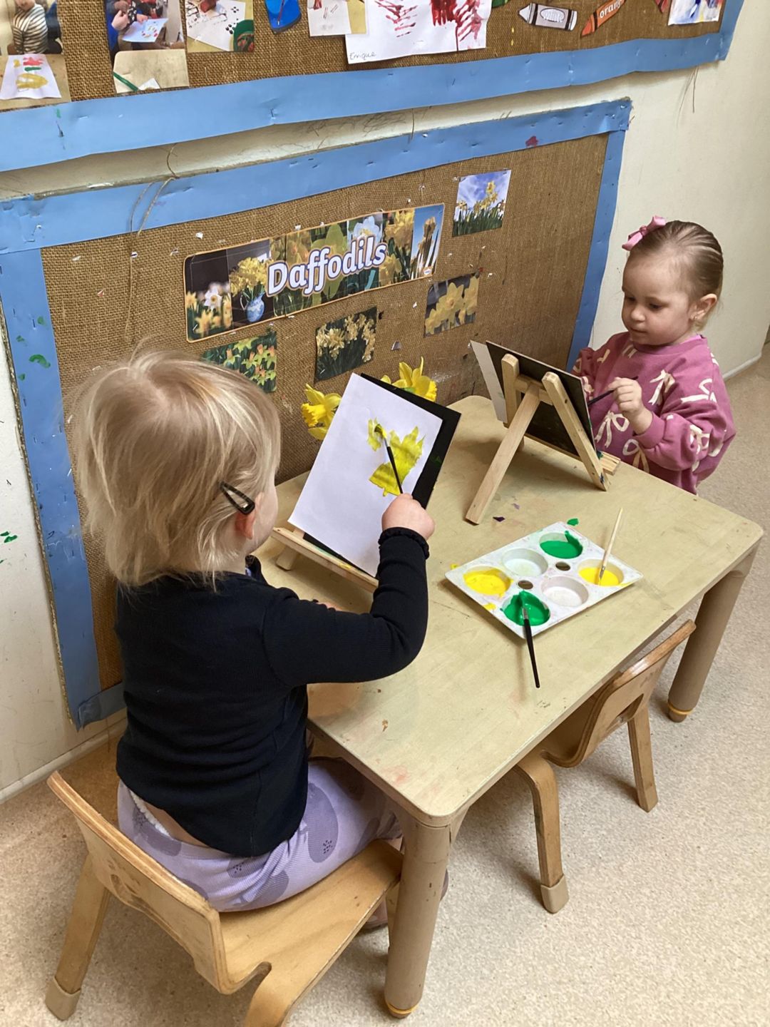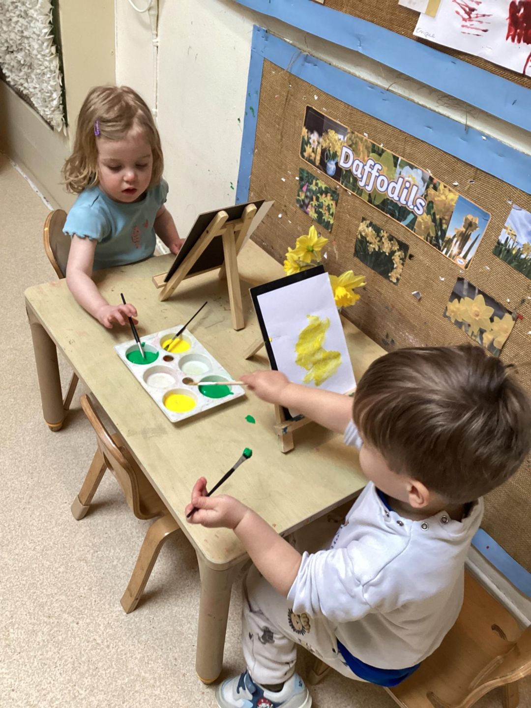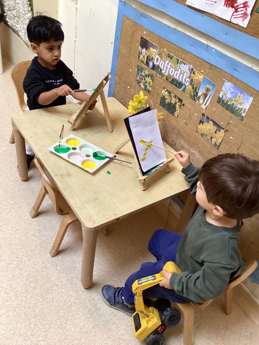 This morning, our Butterflies class enjoyed a calm and creative exploration of spring through still life painting, inspired by daffodils. The children began by observing the flowers, taking time to notice the different shapes, textures, and shades of yellow and green. Working in pairs, they talked together about what they could see. This encouraged lots of lovely language, including descriptive words linked to colour, size, and detail. The children then used a range of painting techniques to create their own interpretations of the daffodils. Some children experimented with mixing colours to achieve the right shades, while others focused on the shapes of petals and stems, showing increasing control when using brushes and tools. Well done Butterflies!