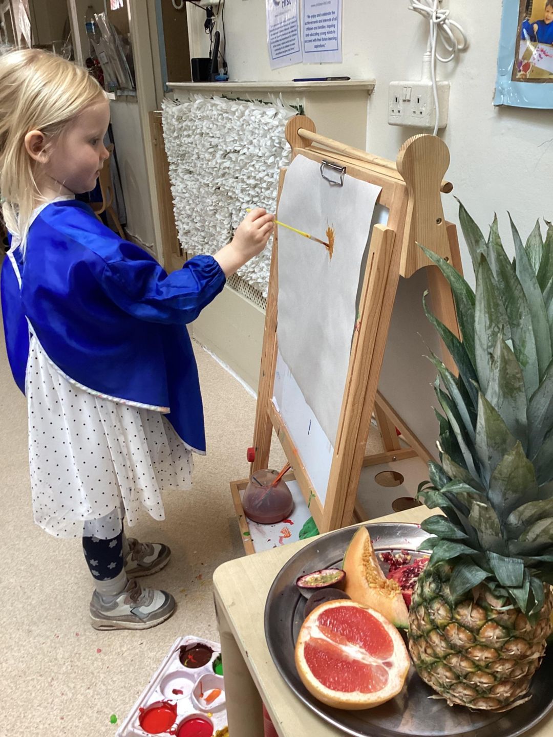 Today the butterflies enjoyed doing some still life painting! They used fine motor skills to dip and swipe the paint over their paper to recreate their version of the fruits. During this activity the children were able to chose their favourite fruit and their favourite colour that was in the bowl. We also spoke about why we should make healthy choices☺️ well done butterflies!