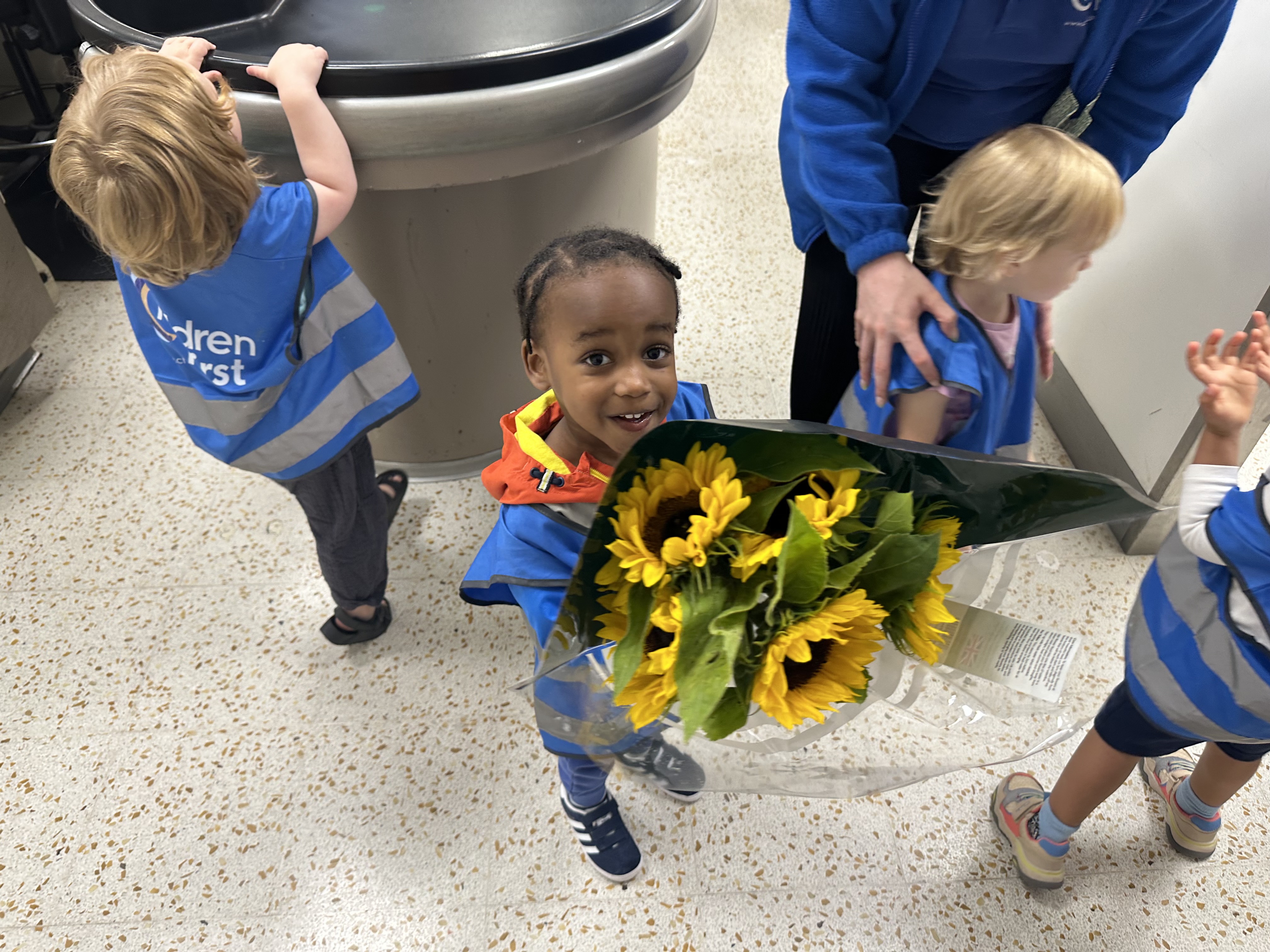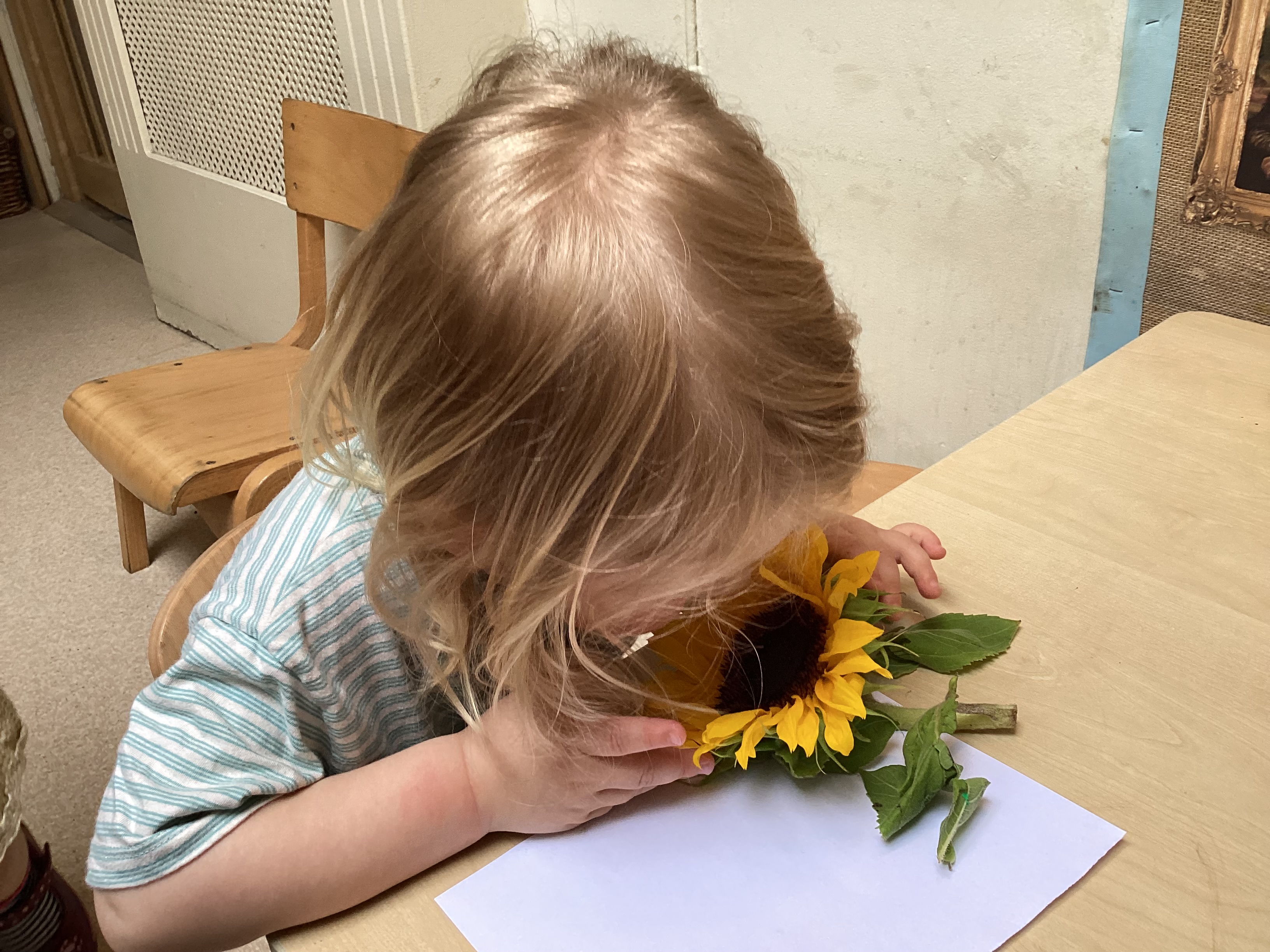 The Butterflies have been exploring sunflowers. They went on a trip to the local shops to purchase sunflowers, browsing the various flowers and deciding to explore the sunflowers. On return to nursery the children designed their own interpretations of the sunflowers, using the sunflowers as objects of reference. Children made marks with the paint on paper attempting to form recognisable parts of the flowers and giving meaning to the marks they made on the paper. Exploring the creativity process and focusing on the process rather than the finished product.