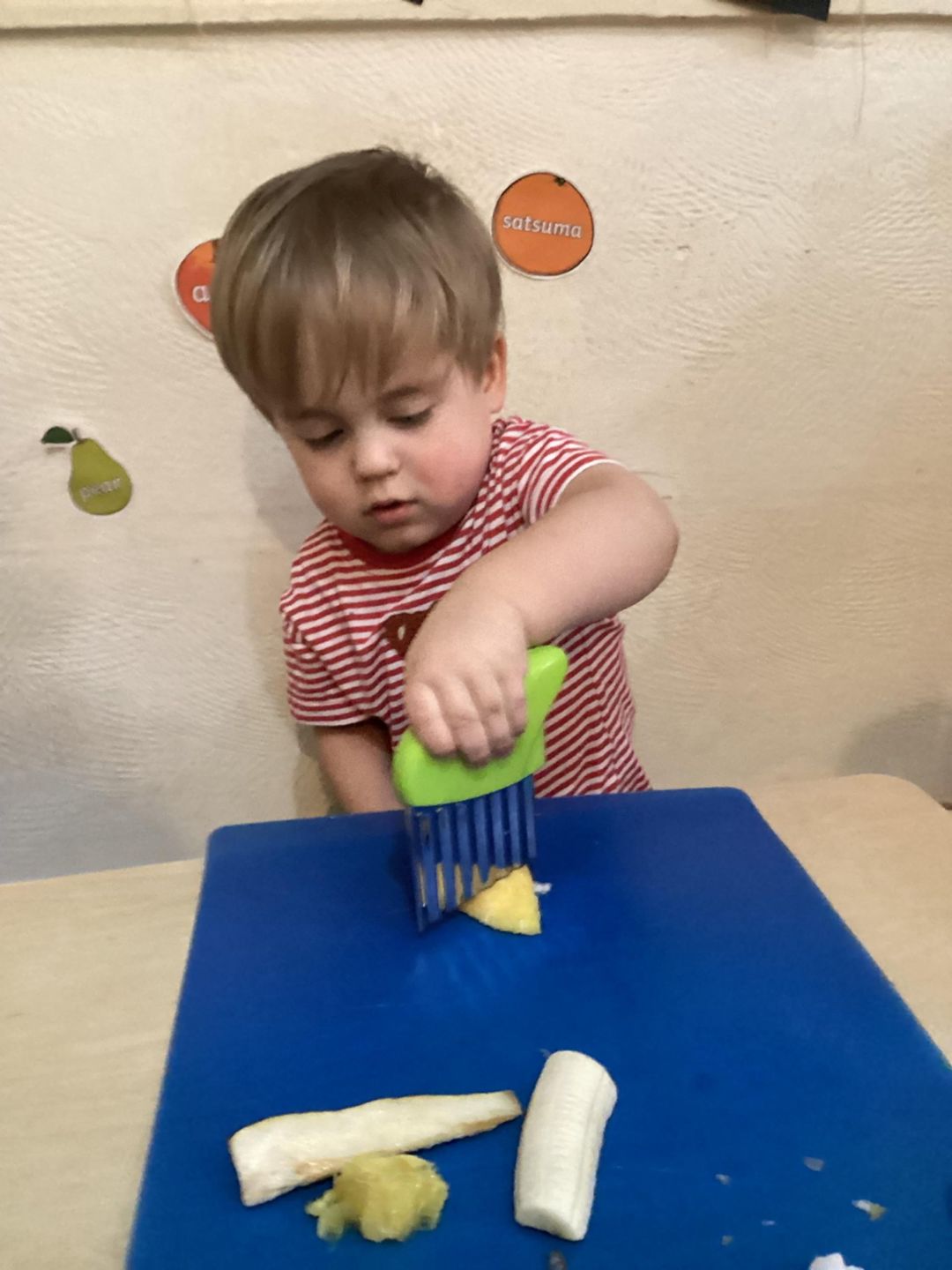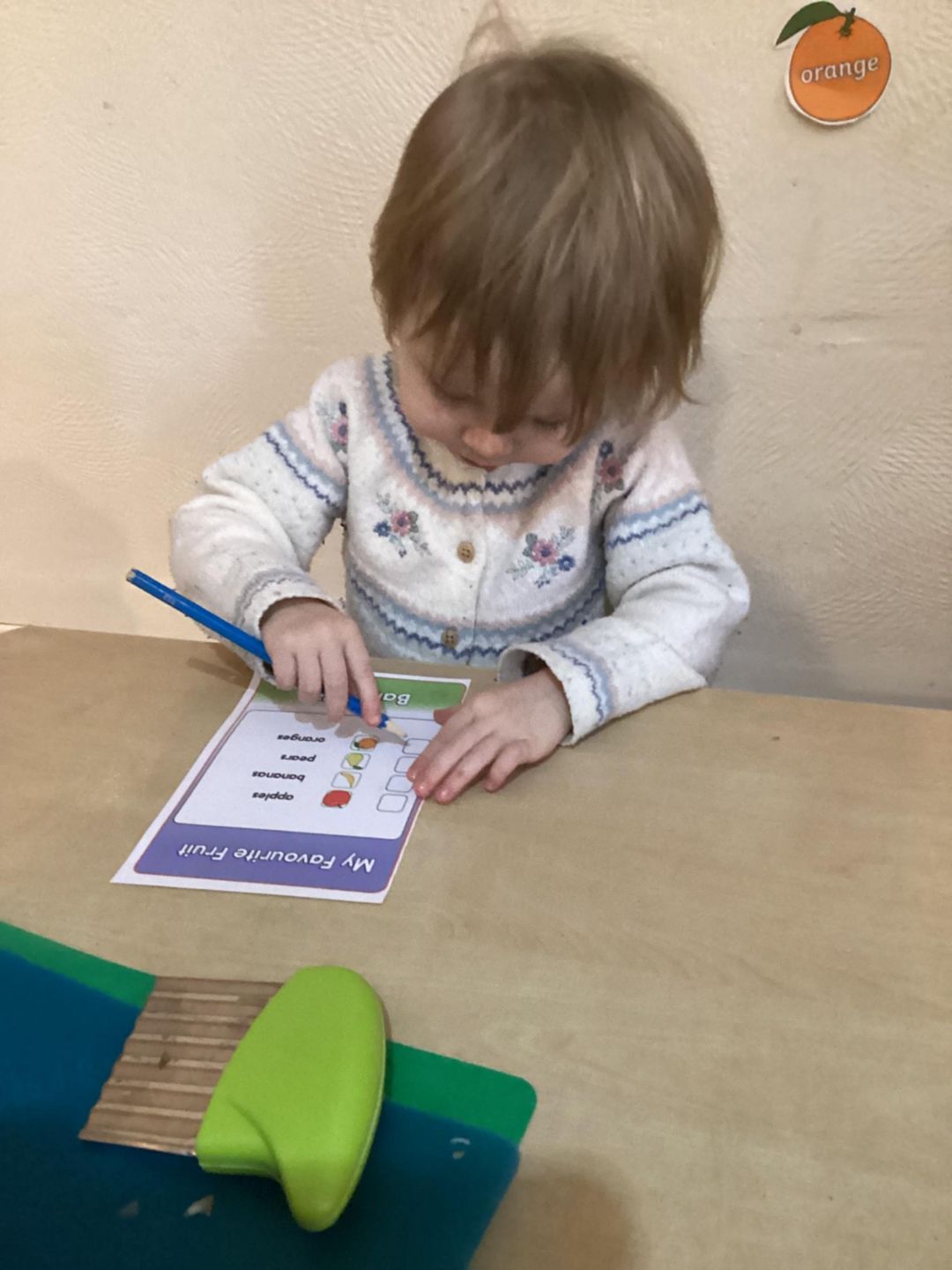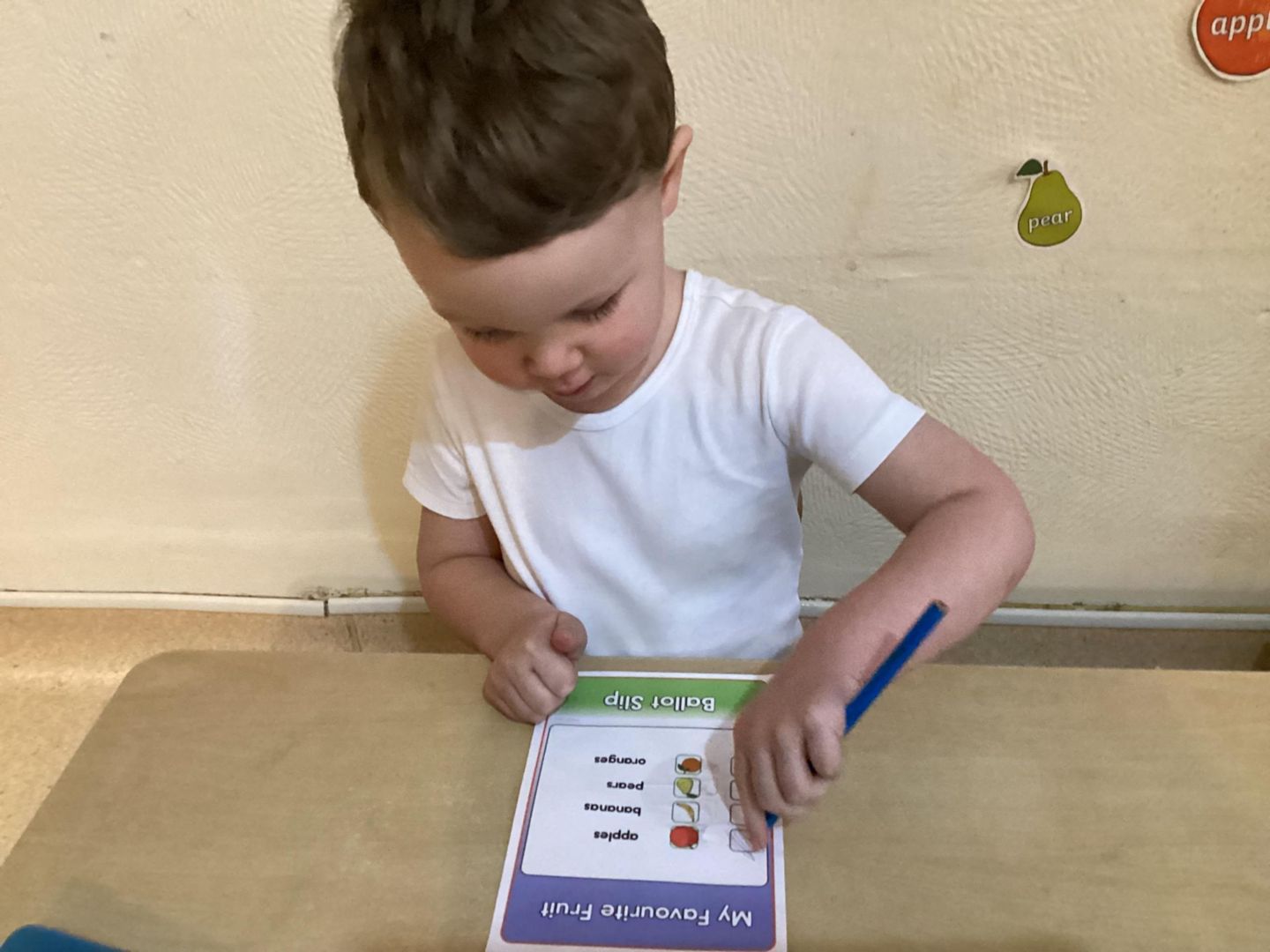 The Grasshoppers took part in an engaging fruit ballot activity. In small groups, the children used child-safe choppers to prepare apple, pear, orange, and banana, showing great focus as they practised their fine motor skills and safe tool use. The children enjoyed tasting the fruit together and sharing their thoughts on flavours and textures, supporting language development and confidence. After snack time, they voted for their favourite fruit using a ballot sheet, learning about turn-taking and fairness. During circle time, the children helped Chelsea count the votes and were excited to discover that orange was the winning fruit.