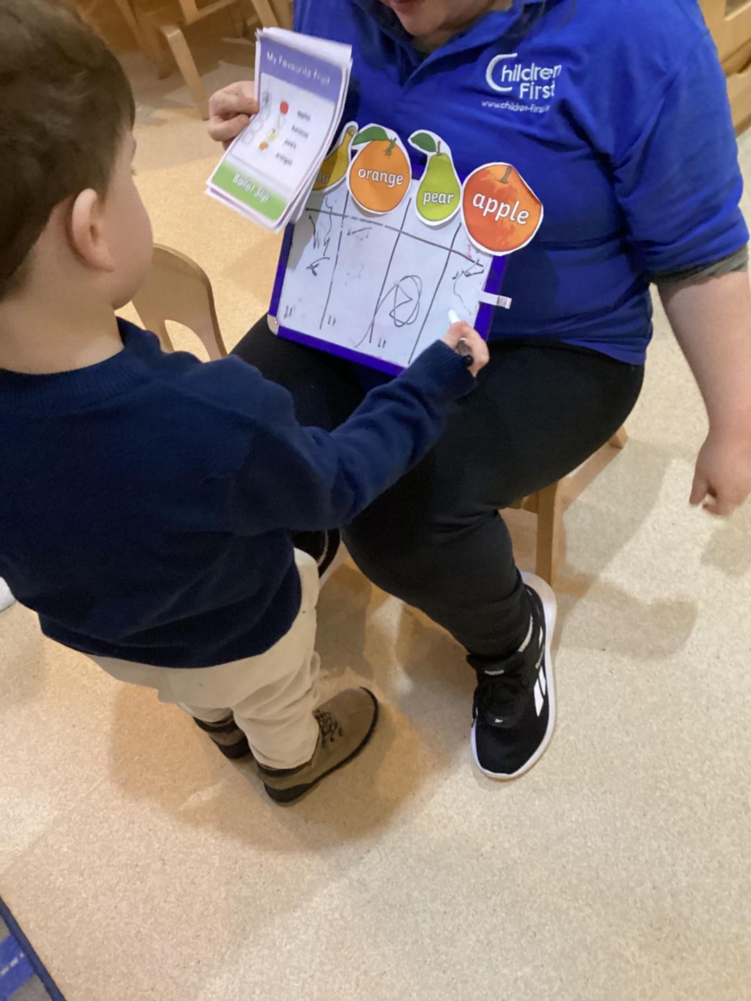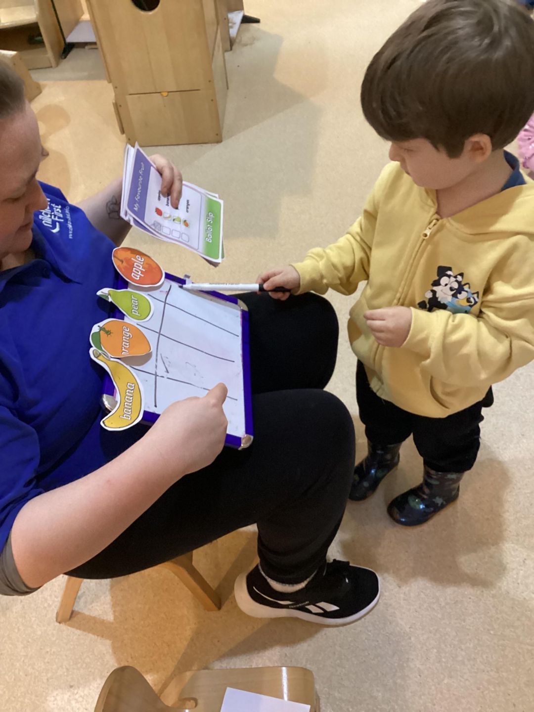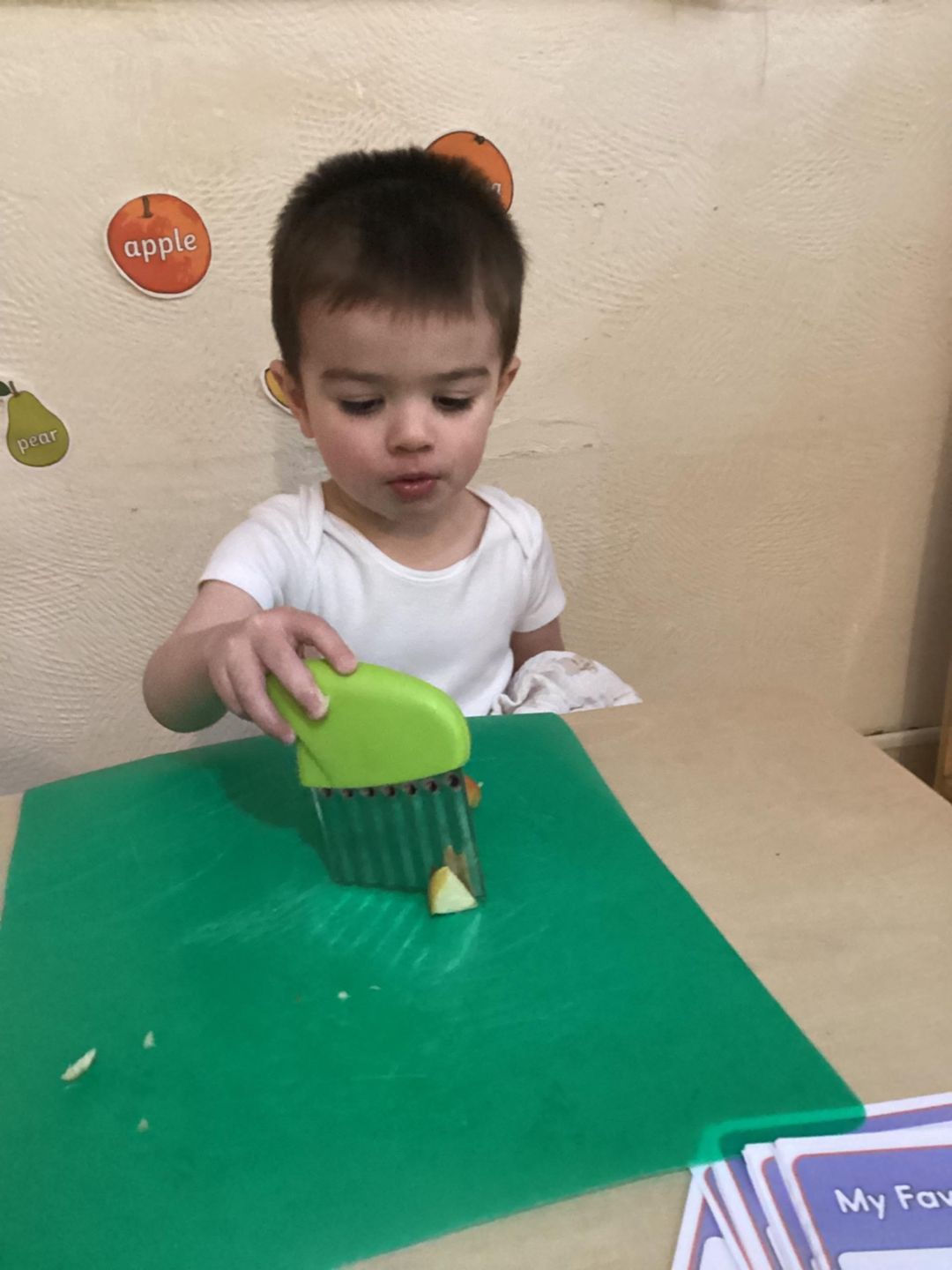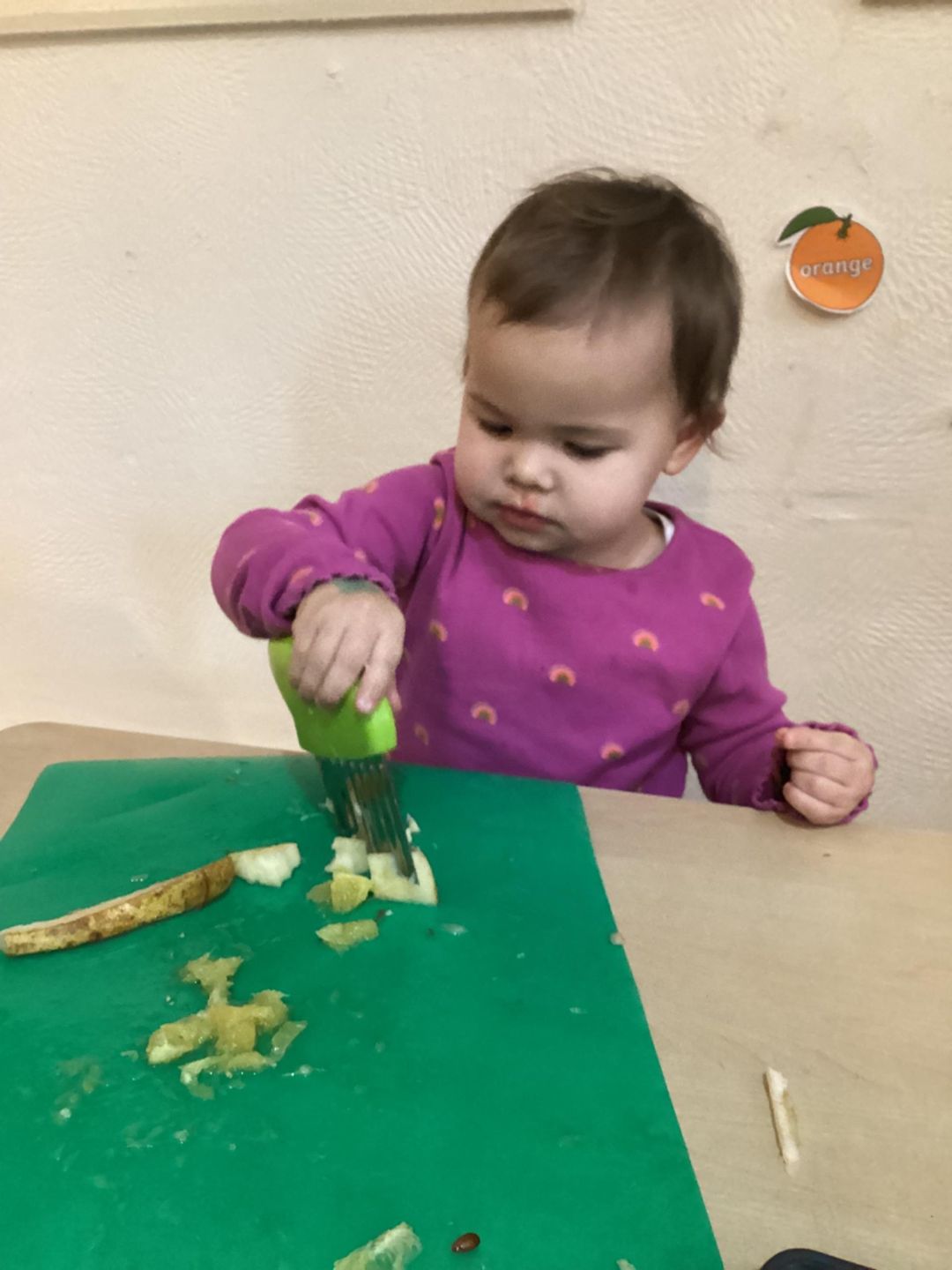 The Grasshoppers took part in an engaging fruit ballot activity. In small groups, the children used child-safe choppers to prepare apple, pear, orange, and banana, showing great focus as they practised their fine motor skills and safe tool use. The children enjoyed tasting the fruit together and sharing their thoughts on flavours and textures, supporting language development and confidence. After snack time, they voted for their favourite fruit using a ballot sheet, learning about turn-taking and fairness. During circle time, the children helped Chelsea count the votes and were excited to discover that orange was the winning fruit.