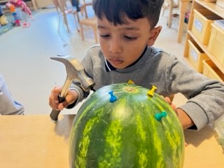 The children used hand eye co-ordination to manipulate real tools to add pins and golf tees to the watermelon. Carefully hammering them in to create their desired effect. Holding the pins supported children's fine motor skills to excel their early writing skills.