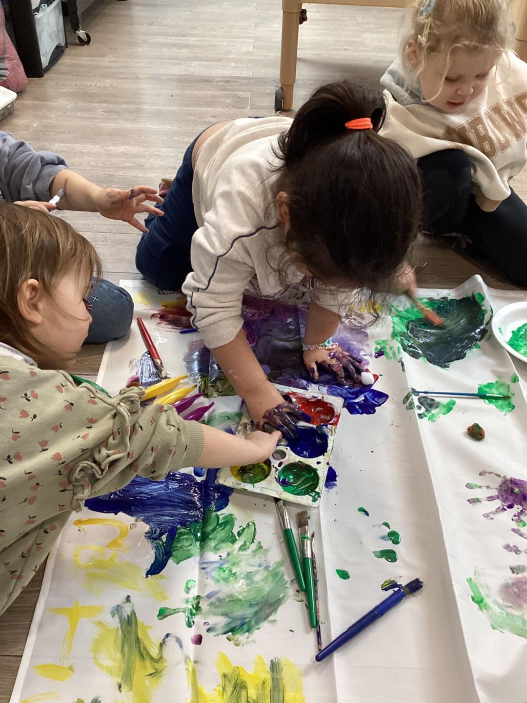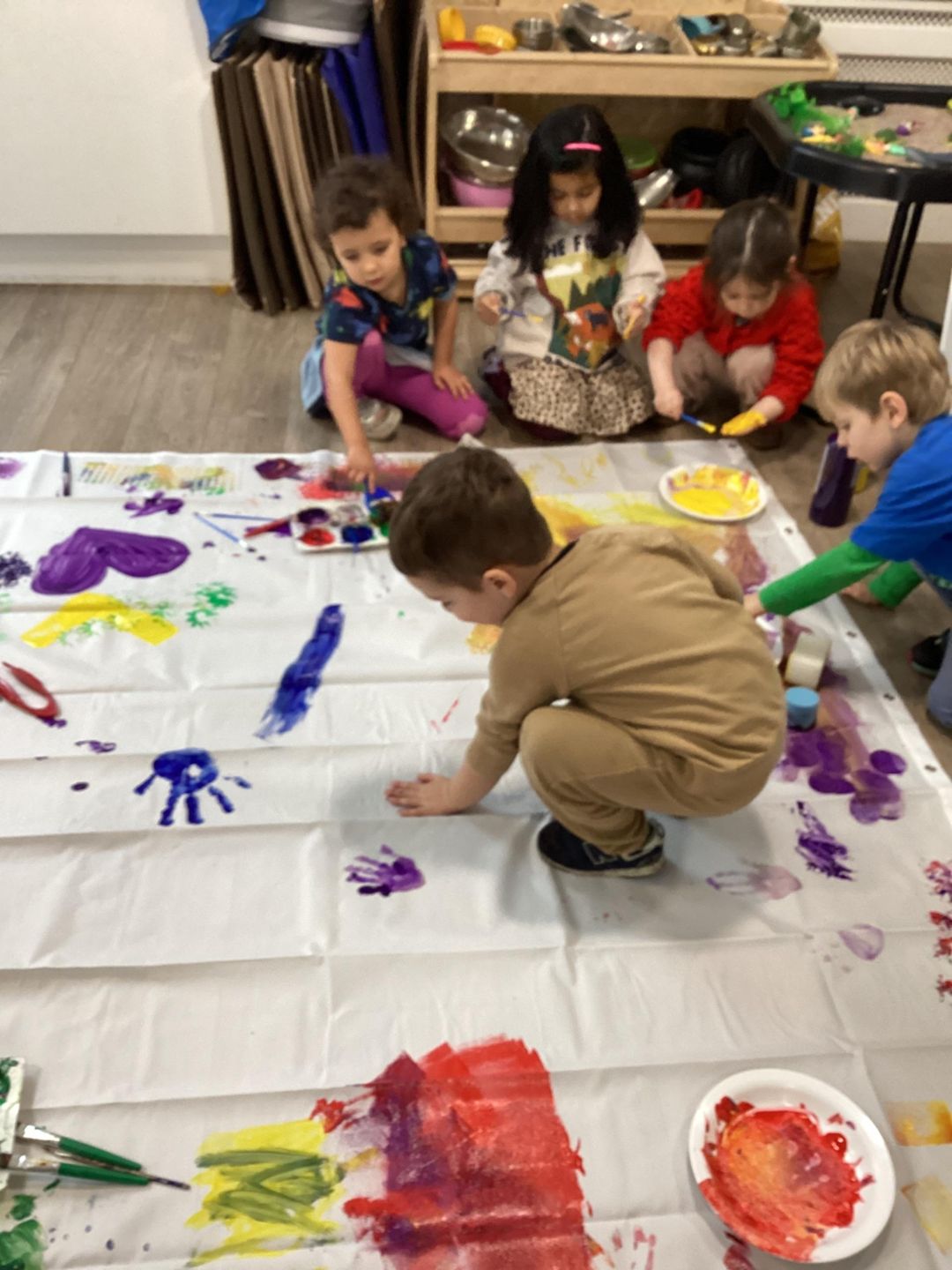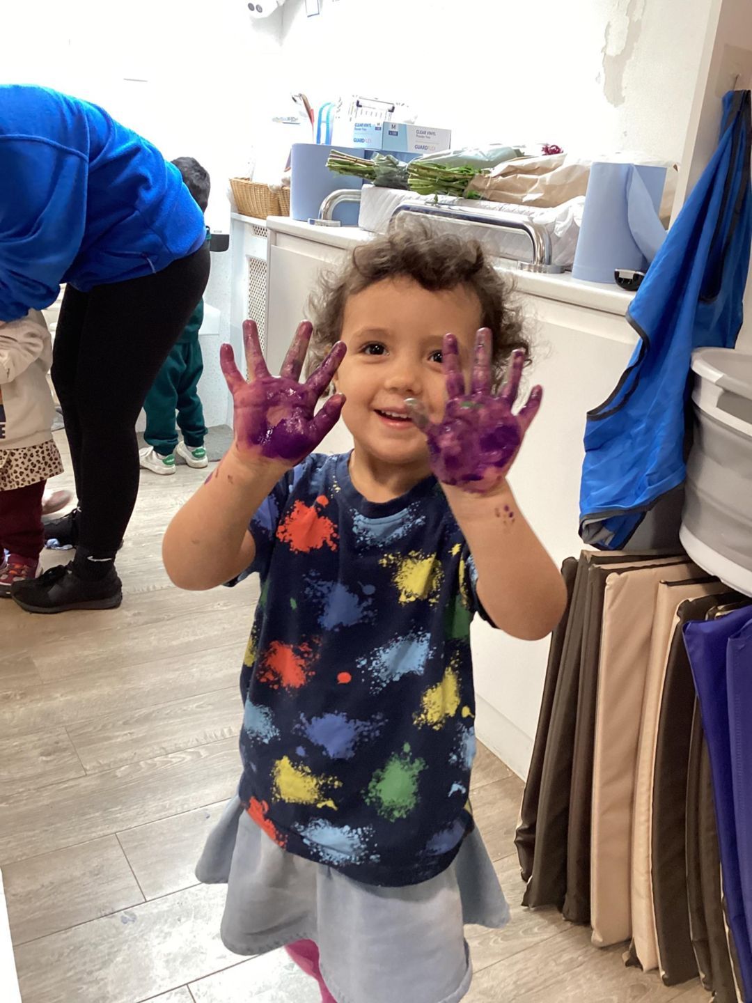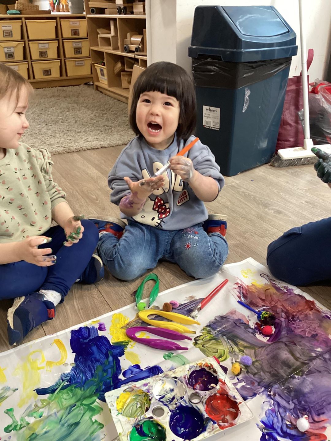 Today we are doing large-scale painting on a shower curtain to support children’s emotional well-being during Children’s Mental Health Week. This activity gives children the freedom to explore paint using big movements, helping them express feelings in a fun and relaxed way. Through this experience, children will enjoy choosing and mixing colours, making marks with their hands and brushes, using their bodies to create large movements, and sharing space and resources with friends, building confidence, communication, and a sense of happiness and belonging.