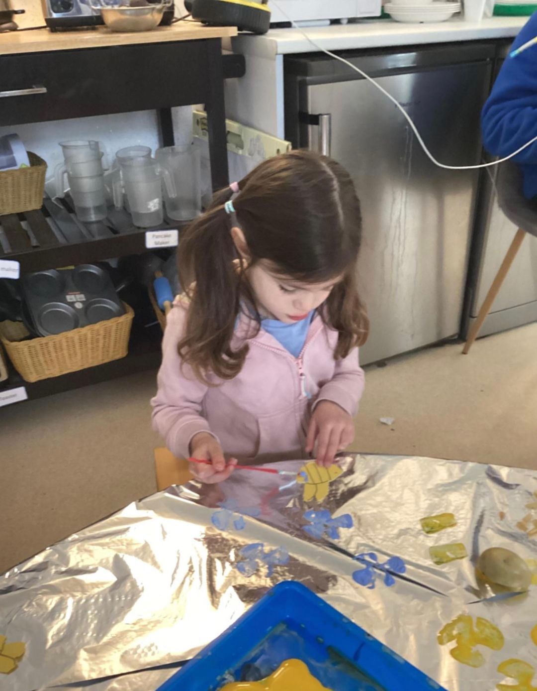 The horses started by making their own bumblebees and flowers, we then used different resources to watch and find out how the bumblebees collect pollen and move it around the world for us and make us our honey, using cotton buds and crushed wotsits to watch how the pollen is moved between flowers and around our earth.