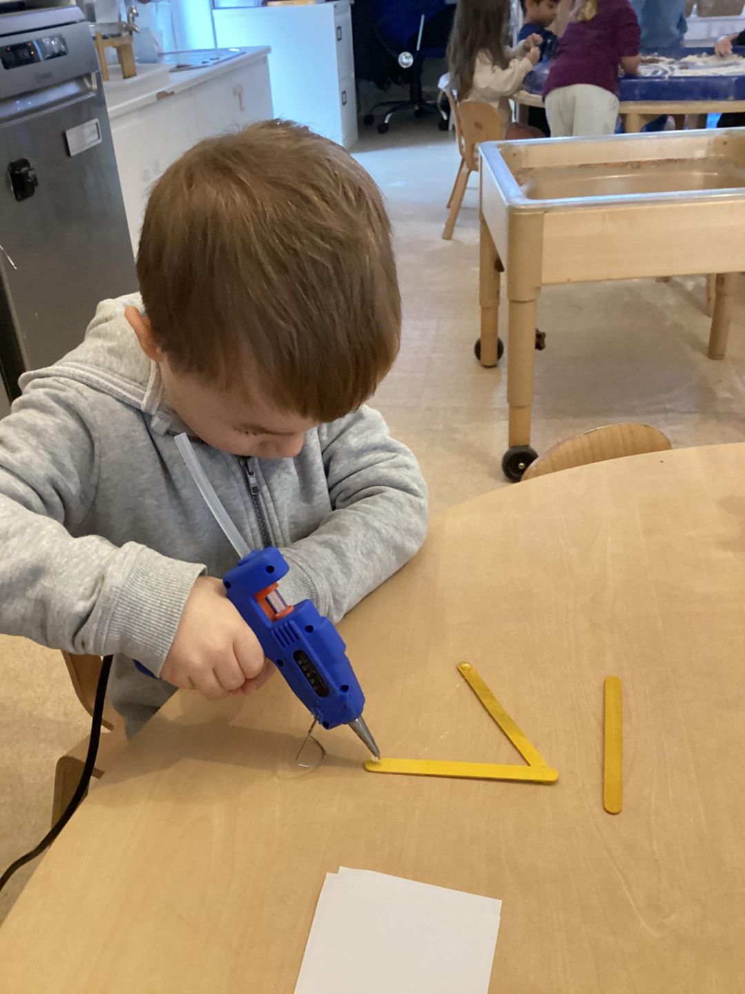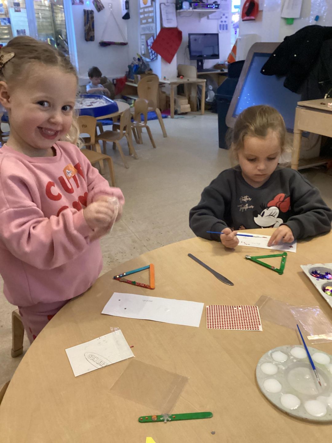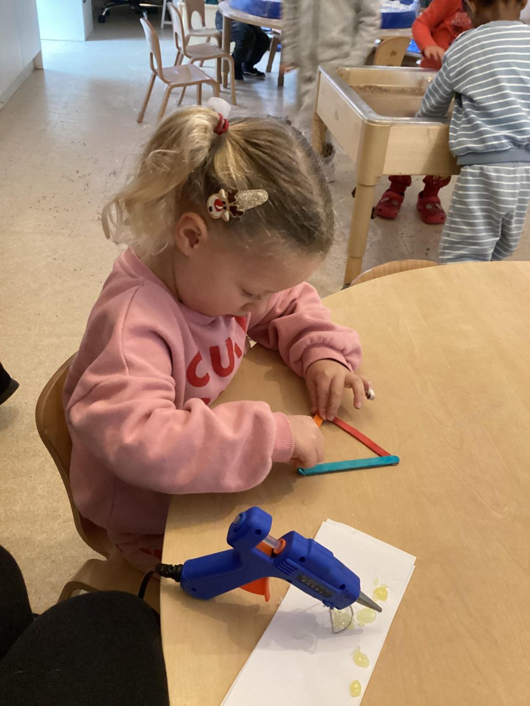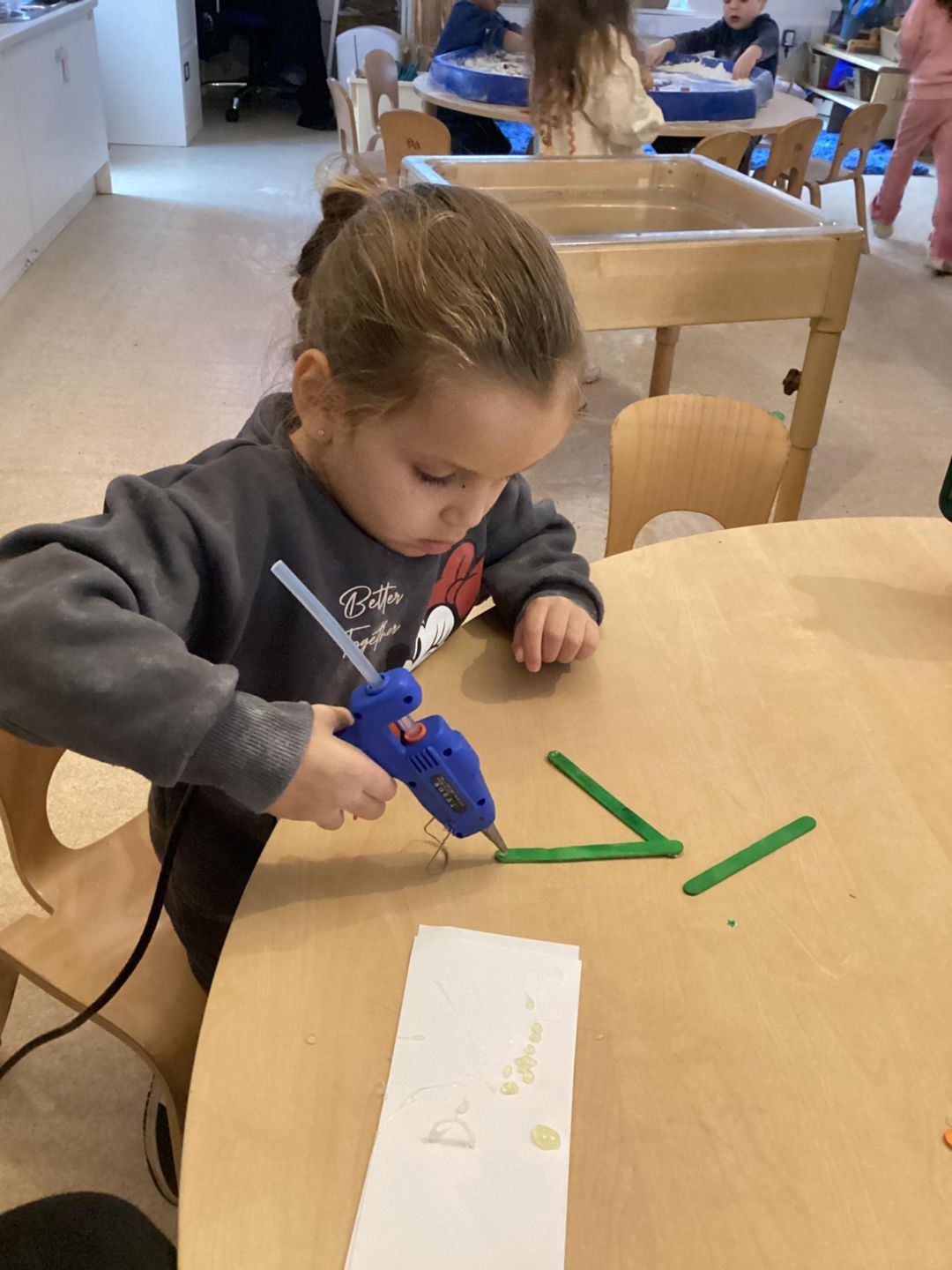 This week the Blazes used their fine motor skills to carefully assemble some beautiful Christmas decorations! They started by picking 3 different lollipop sticks to make the shape of a Christmas tree. Then we discussed how to safely use a glue gun and why we have to be careful. One by one, the blazes put some hot glue on each stick and attached them together to make a triangle! When it was dry we used lots of different Christmassy sparkles to add decorations to our trees. Well done Blazes!