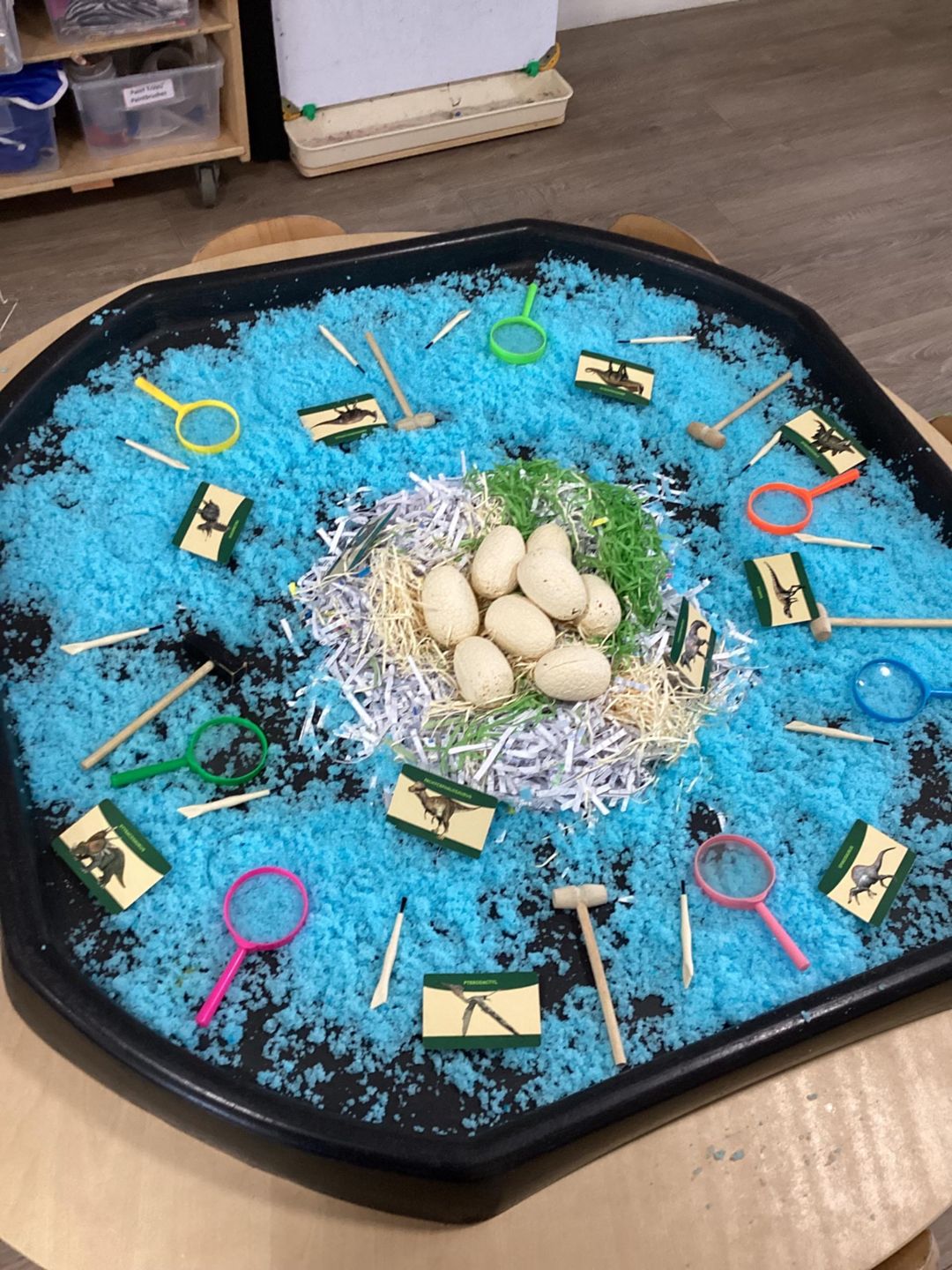 Our Dino Dig was a huge success! The children became paleontologists as they explored fossils buried in sand, soil and sensory materials. They used a variety of tools and resources including brushes, scoops, magnifying glasses and even cameras to photograph and document their discoveries. The children discussed their findings, compared sizes and shapes, and worked collaboratively to carefully excavate the “fossils.”