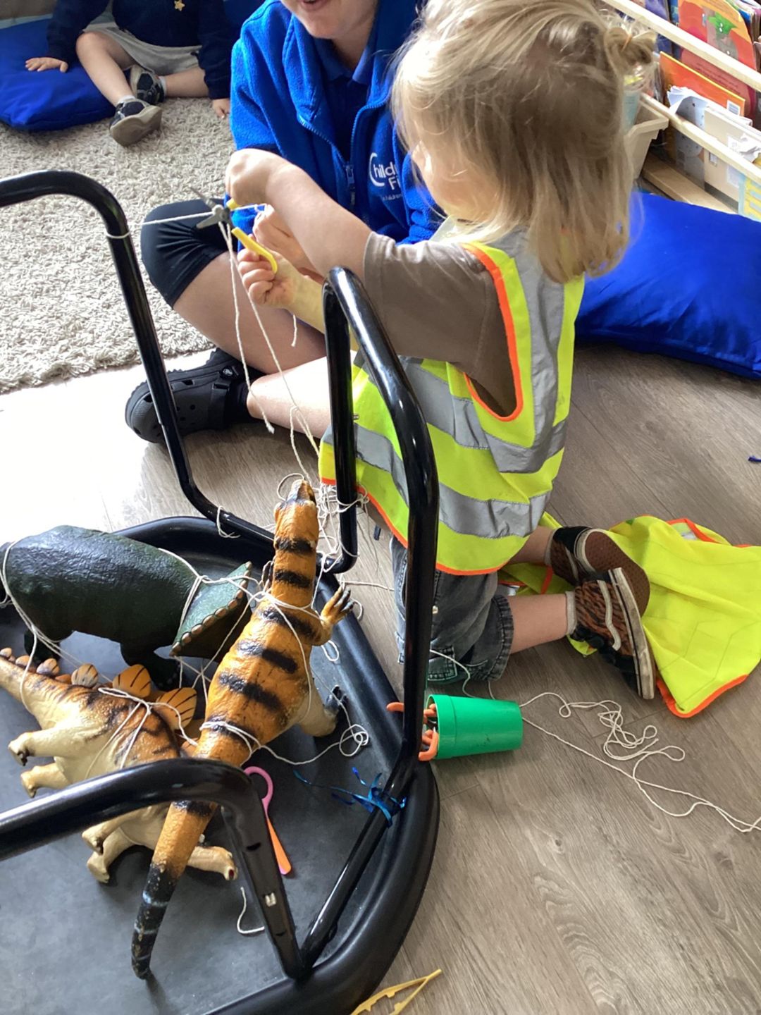 They were very proud of themselves when they freed the dinosaurs, did great listening during the risky play and followed instructions so that we could all stay safe with sharp objects, and even helped tidy up the string at the end! Well done Ponies!