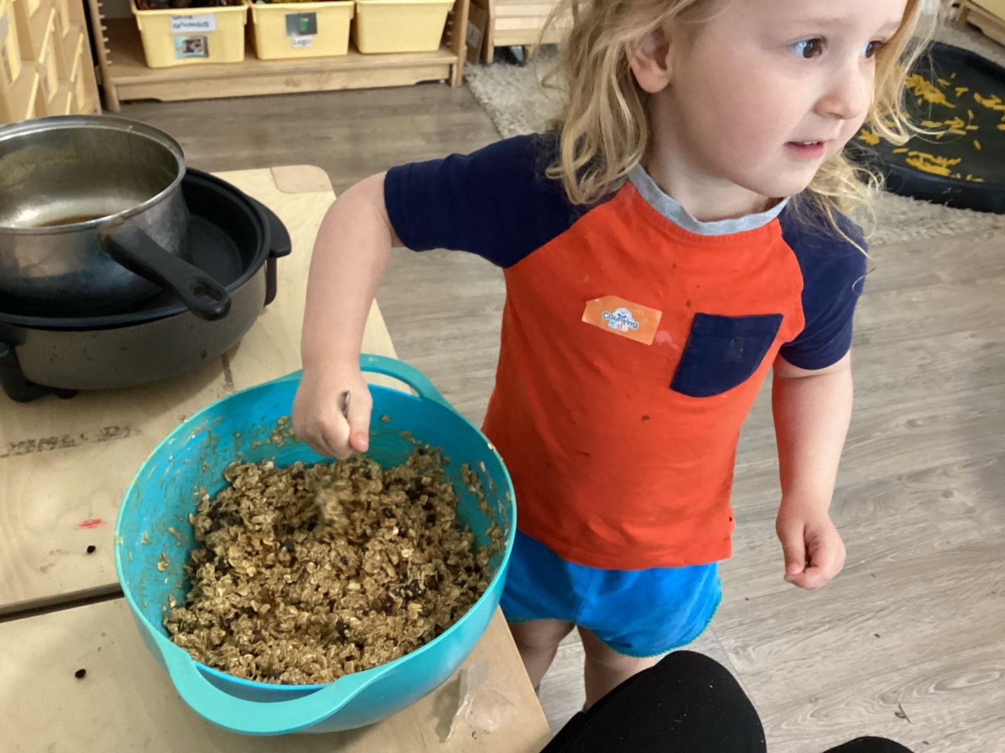 After many discussions during lunch times about what their favourite pudding is, the final vote was a yummy flapjack with raisins so today they got to make their very own ones!