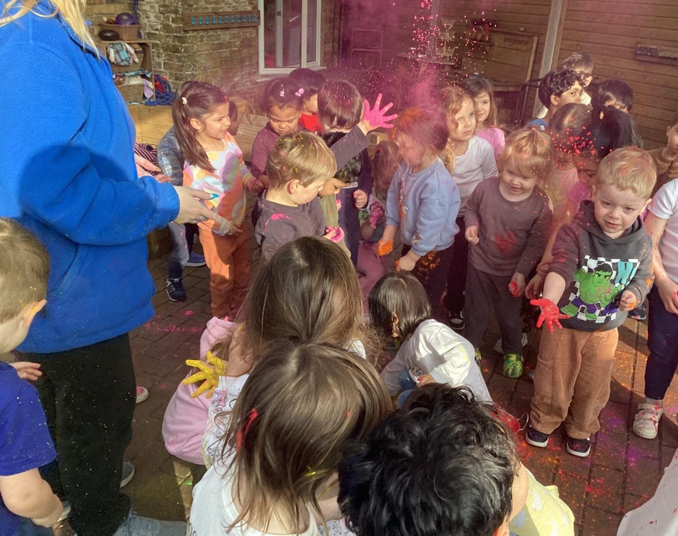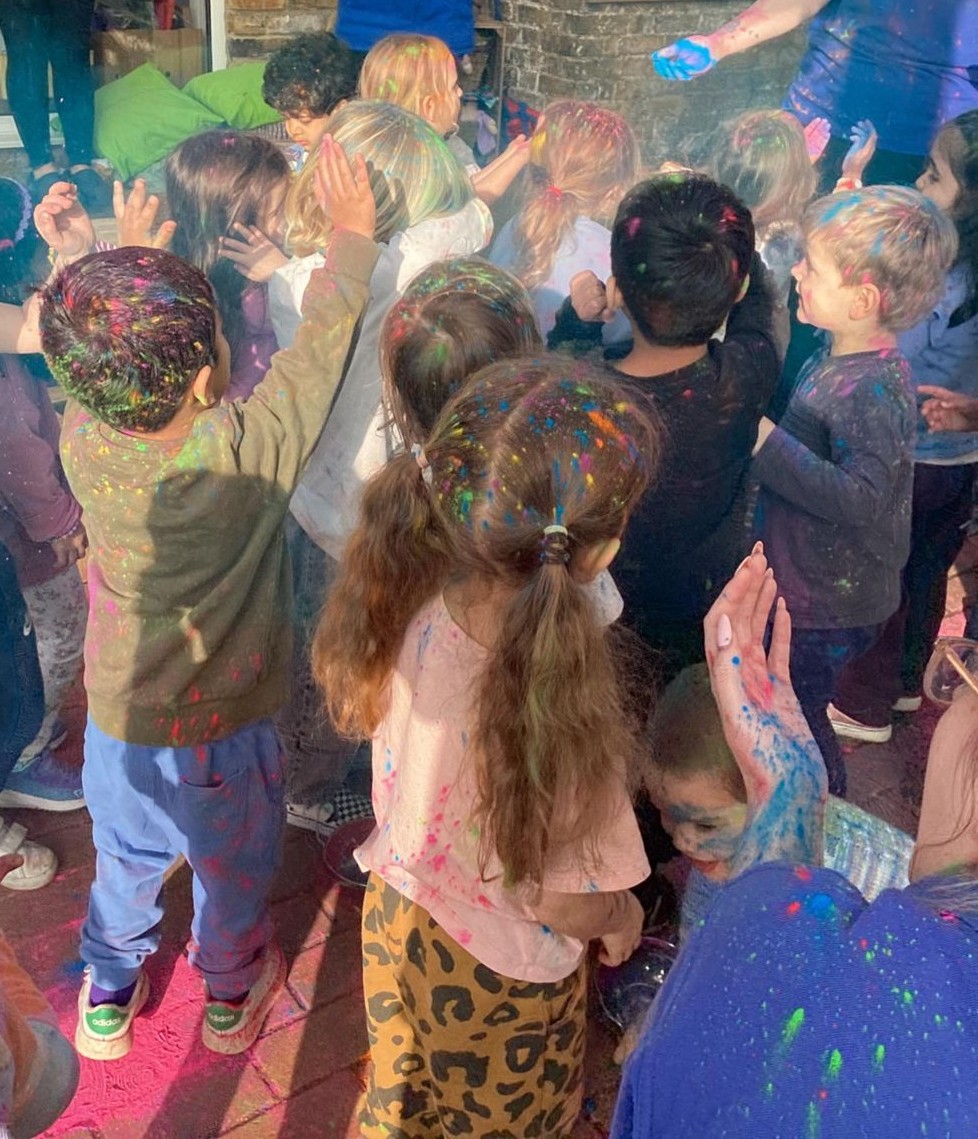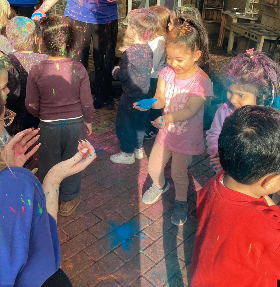 Today at preschool, we celebrated Holi and had an amazing time watching the different colours in the air. We loved being covered in colour, just like a rainbow.