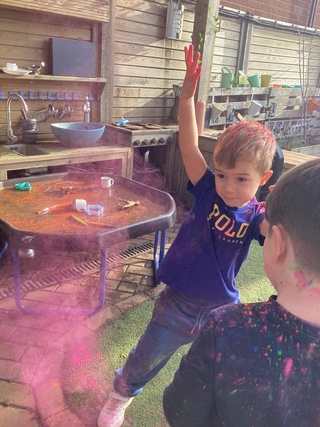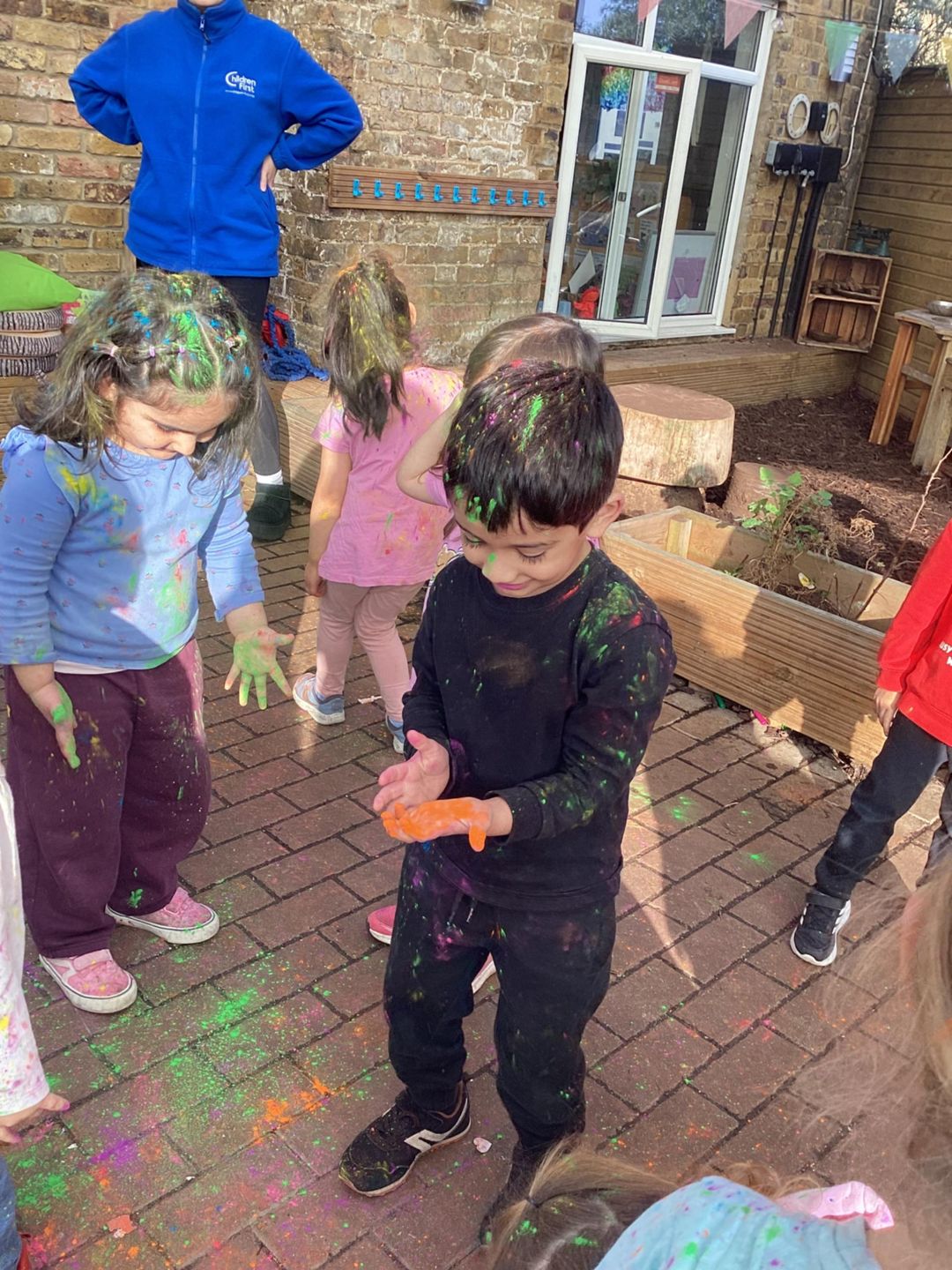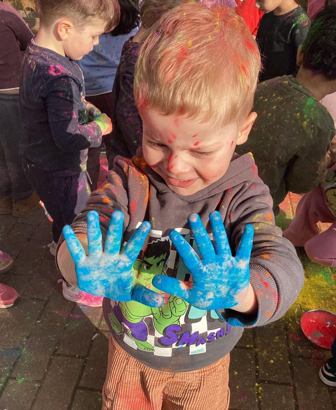 Today at preschool, we celebrated Holi and had an amazing time watching the different colours in the air. We loved being covered in colour, just like a rainbow.