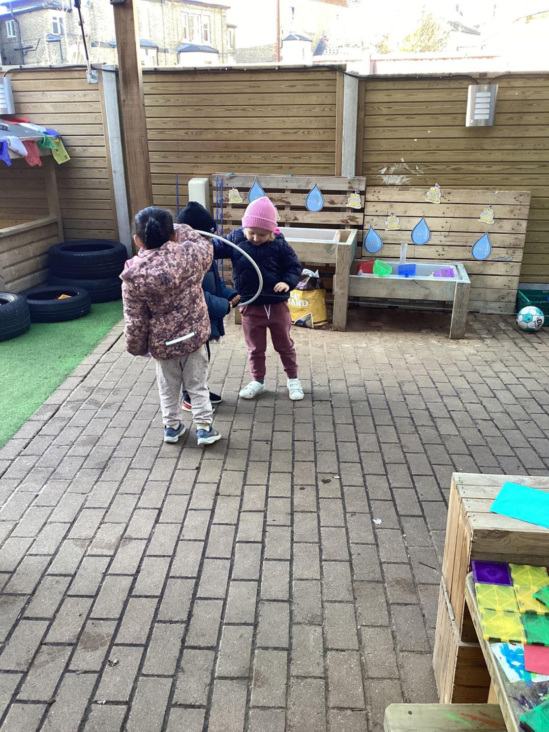 In the first challenge, they worked in pairs to pass one hula hoop over a friend and onto the next person using a string. It took a bit of practice and a lot of communication to figure out the easiest way to do it.