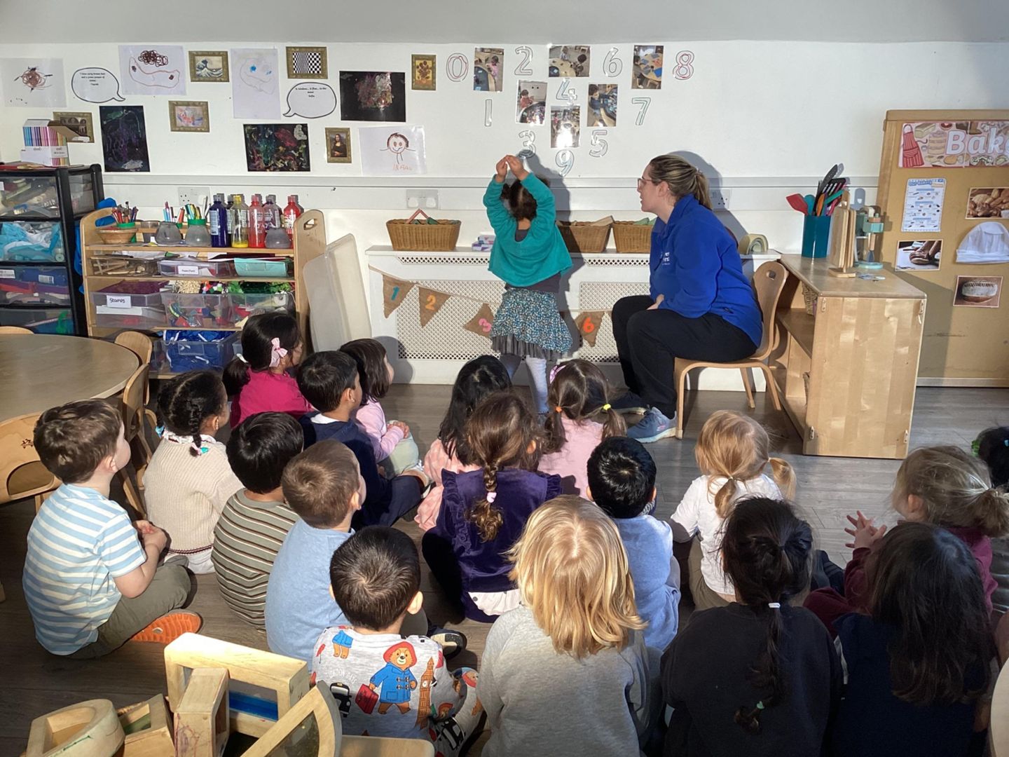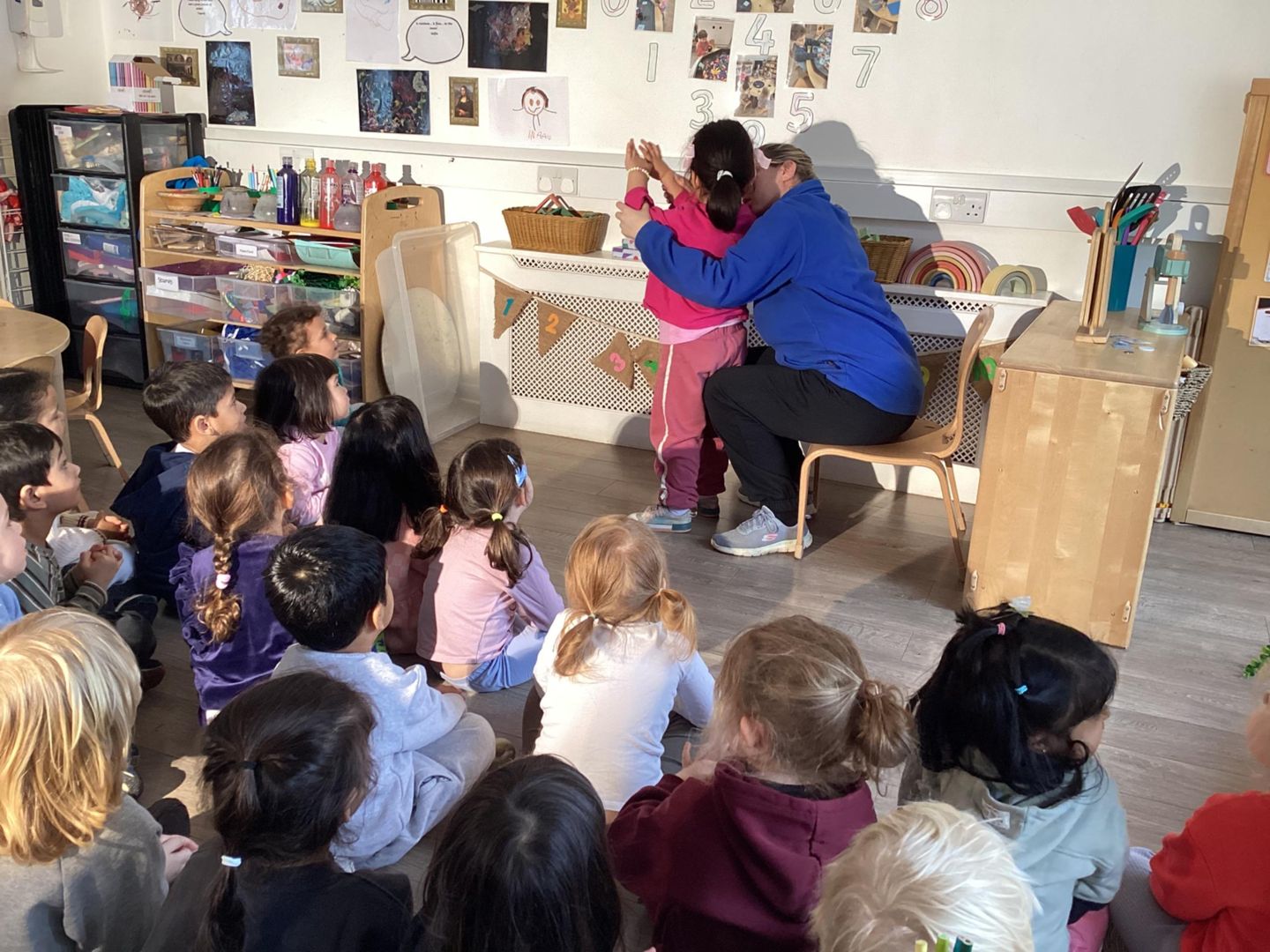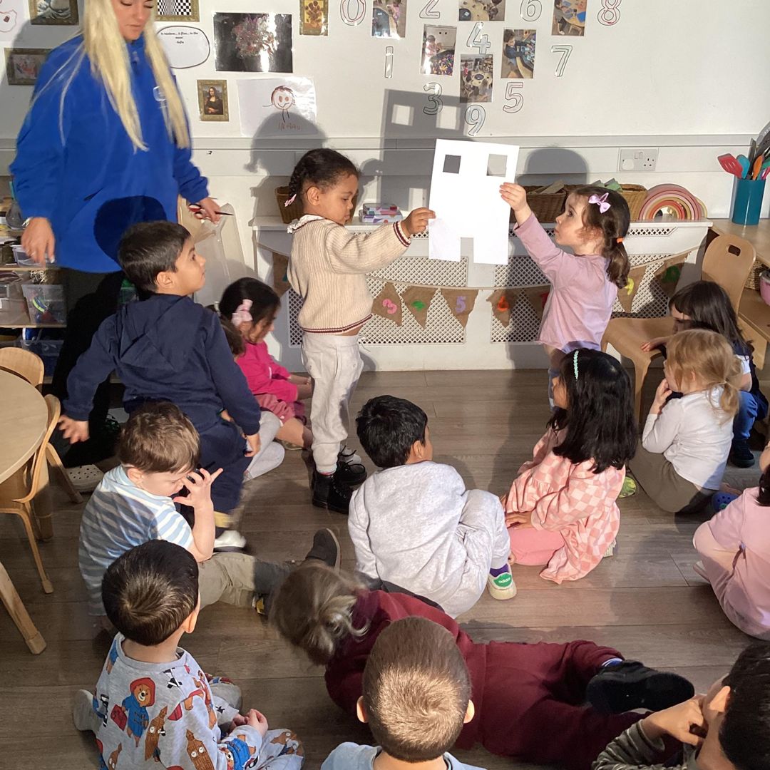 During this engaging group activity, the children were introduced to the concept of light and shadows through hands-on exploration. A light source was set up at the front of the room, and each child was given the opportunity to come forward individually to create their own shadow puppet. As they experimented with different hand shapes and movements, the children demonstrated creative development through imaginative play, while also using problem-solving skills to explore how their shadows changed in size and shape depending on their position. Taking turns and standing in front of the group supported their personal, social, and emotional development, helping to build confidence and awareness of others.