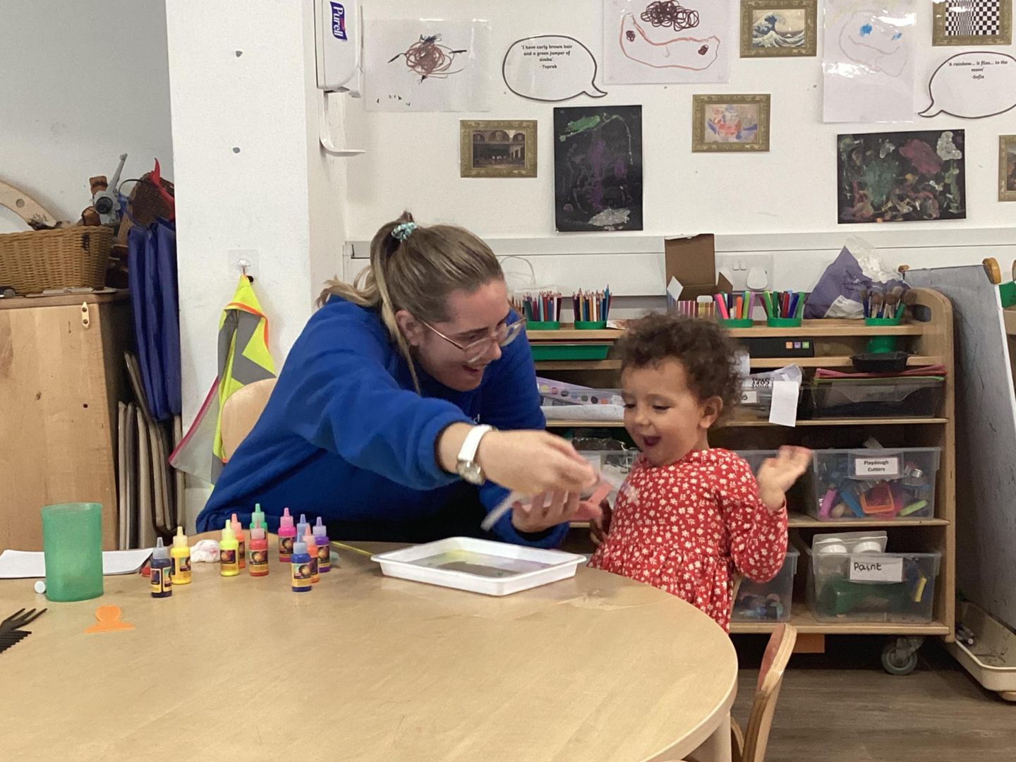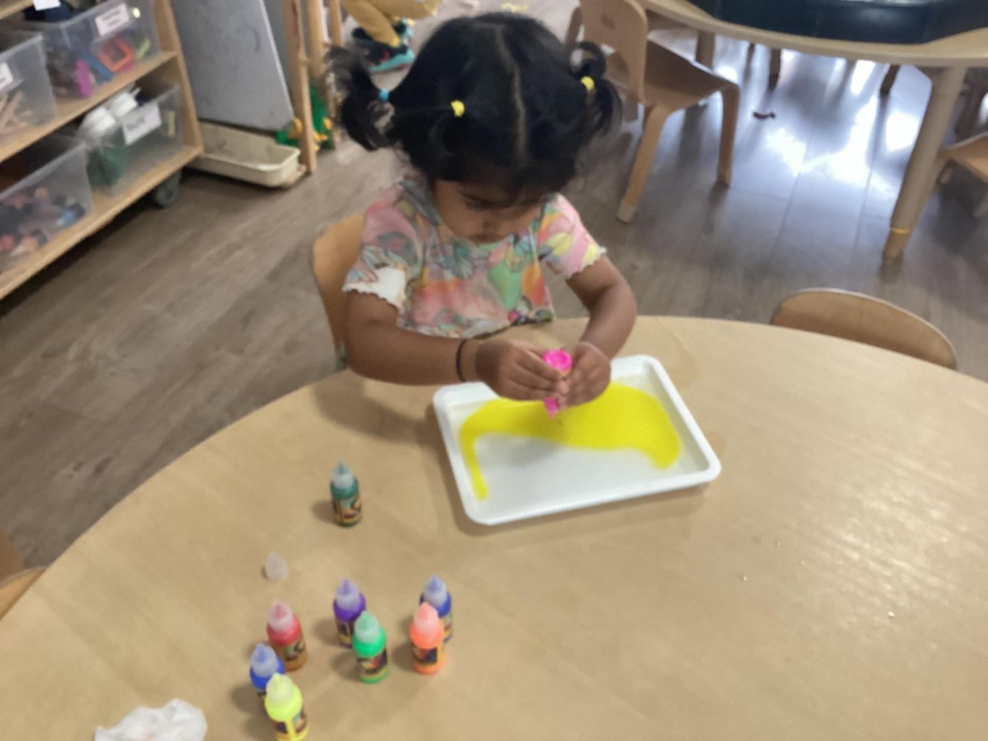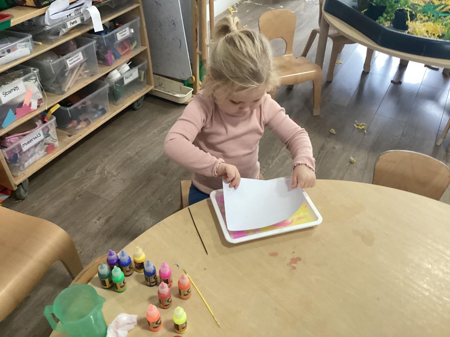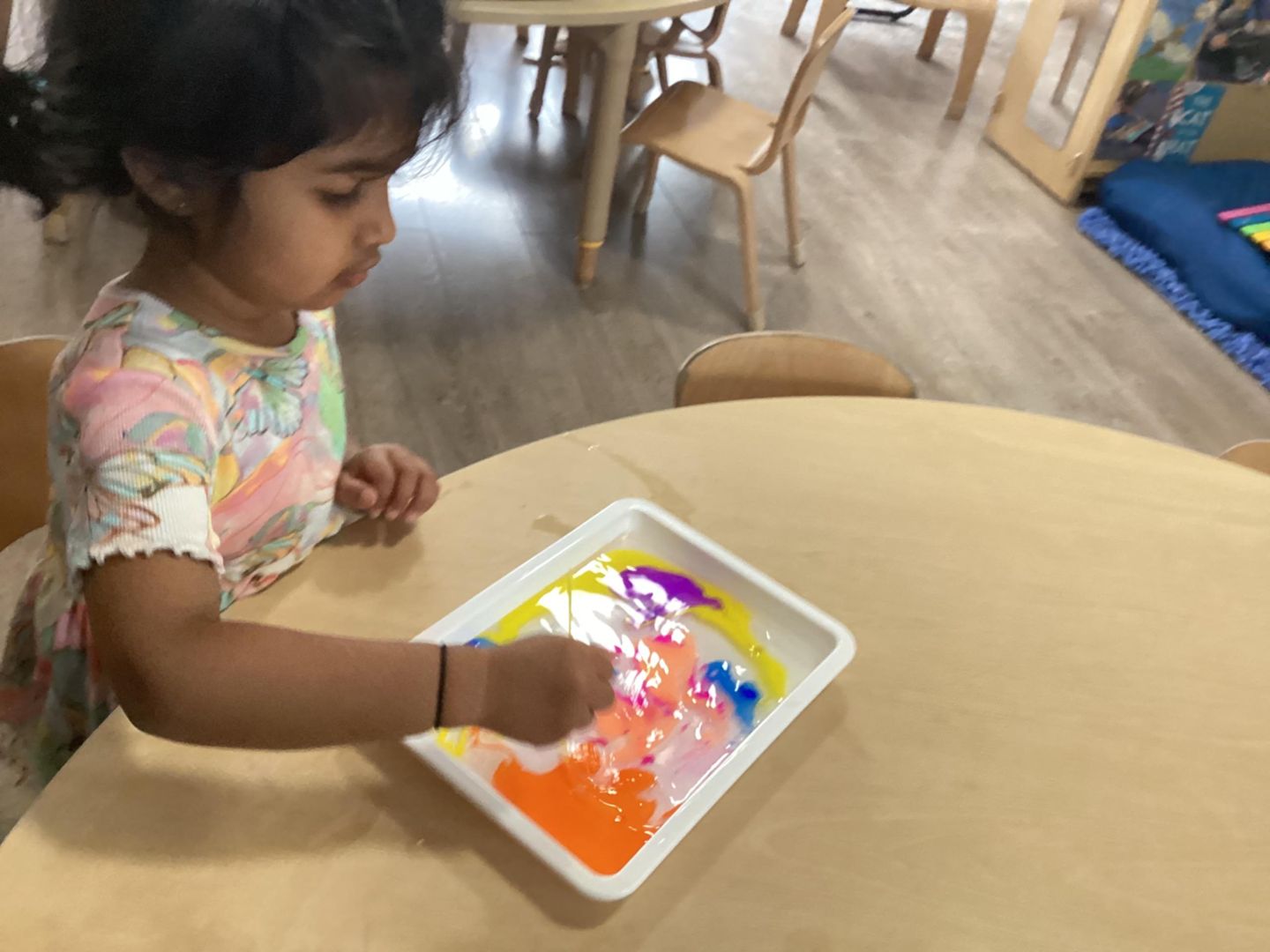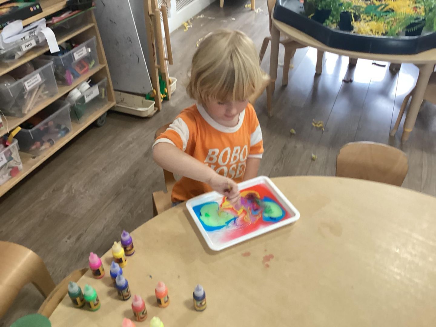 Today, the stars have been experimenting with various methods of creating artwork. We explored marbling paint by first pouring water into a tray, then adding our chosen colours of marbling paint. We had the option to mix the paints or leave them as they were before placing the paper on top of the water, allowing the paint to be transferred onto the paper. Once we lifted the paper, we examined the patterns we had created. There were so many different shapes and a wonderful array of colours, ranging from vibrant hues to darker tones. We were all thrilled to see the beautiful patterns we had made.