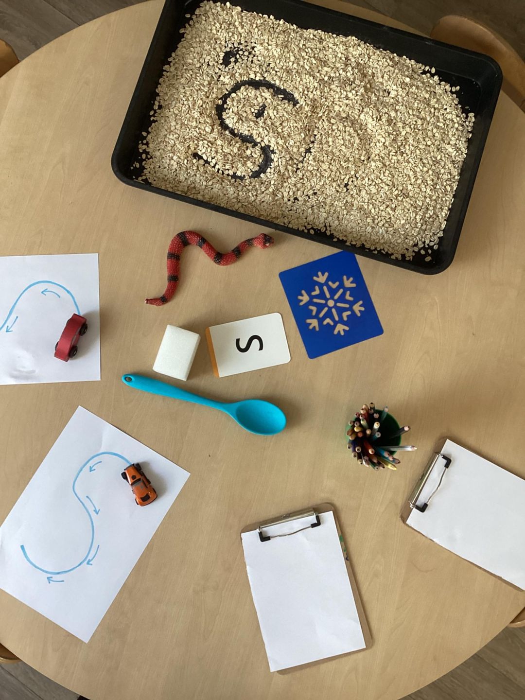 Today we explored the letter S through three engaging, hands-on stations to support early writing development.