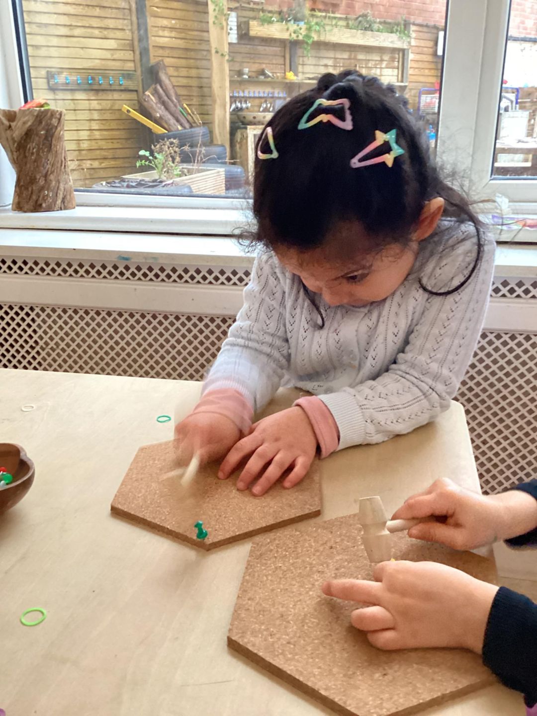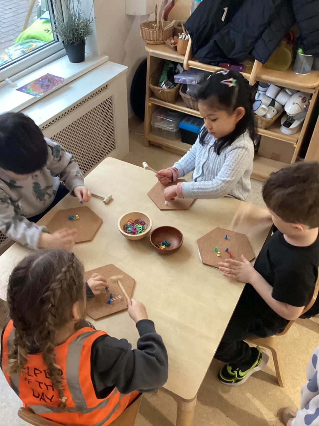 Over the past few days, the Blaze class has been exploring pin boards with various resources. We recently introduced real pins into our risky play. Before starting, we discussed safety measures and completed a children's risk assessment, focusing on how to stay safe during the activity. Once we had established our confidence, we began using pins and hammers with loom bands to create our own pictures. We also had shape templates to help us replicate the shapes on the boards. We are thoroughly enjoying the opportunity to explore risk safely and can’t wait to do more risky activities in the weeks to come.
