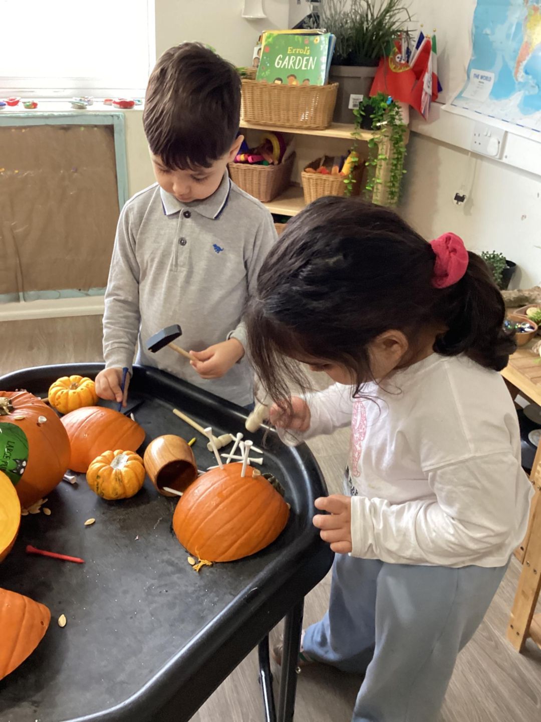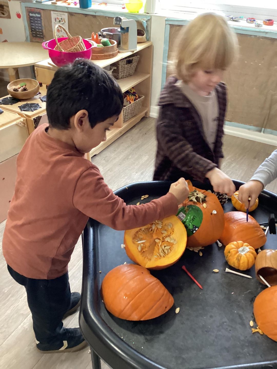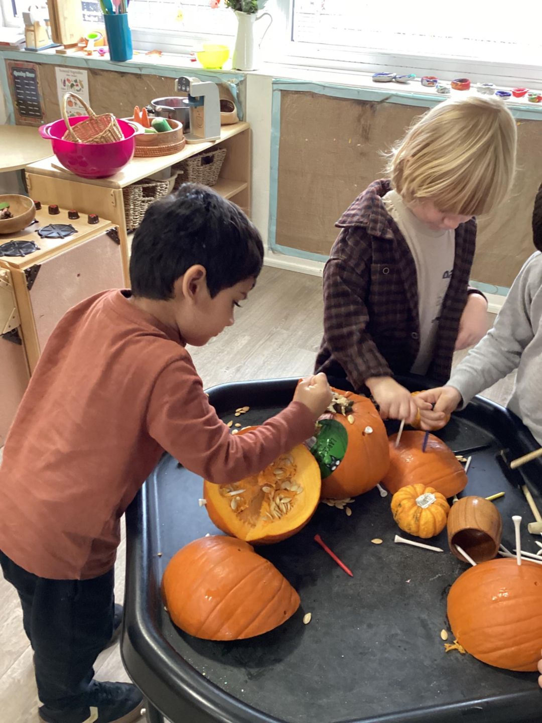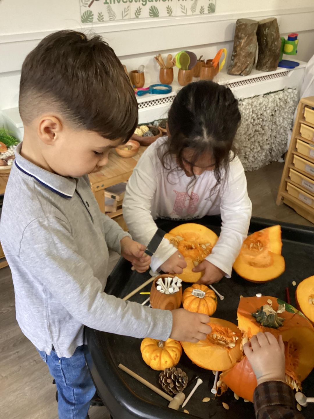 After opening up the pumpkins, the children were excited to have a look inside and explored using their senses to feel, look and smell the pumpkin. They used many describing words such as a stringy, disgusting, smelly, crunchy and hard during their exploration. Some of the children even enjoyed trying to puzzle the pumpkins back together, placing all the pieces as they were cut back together.