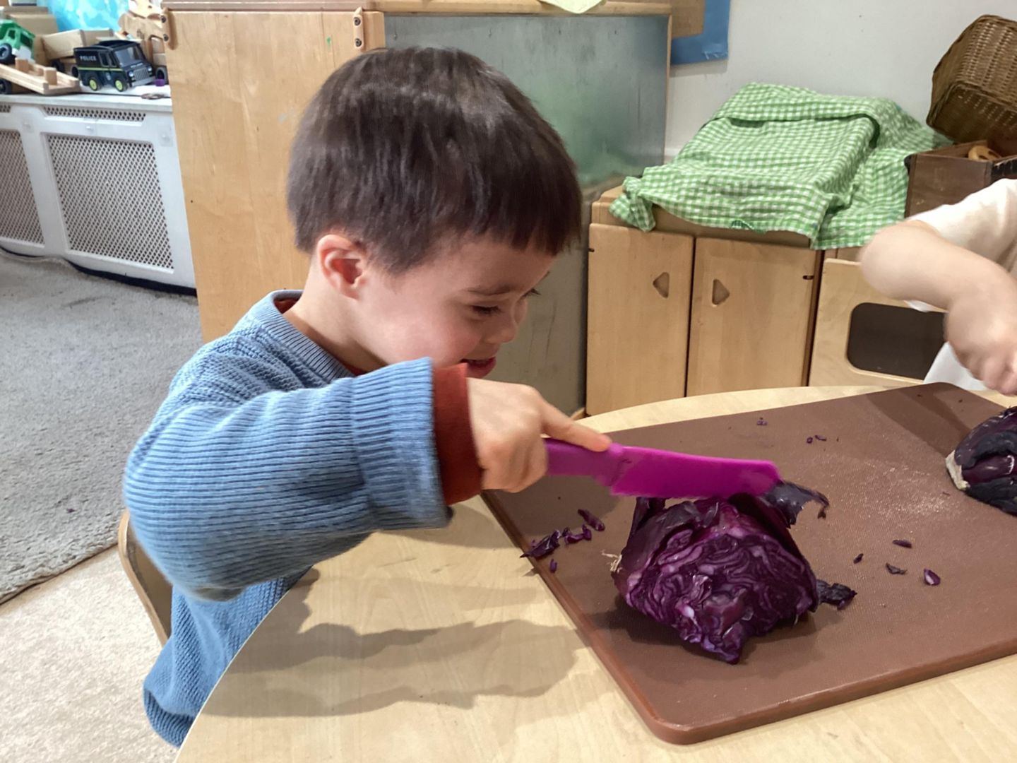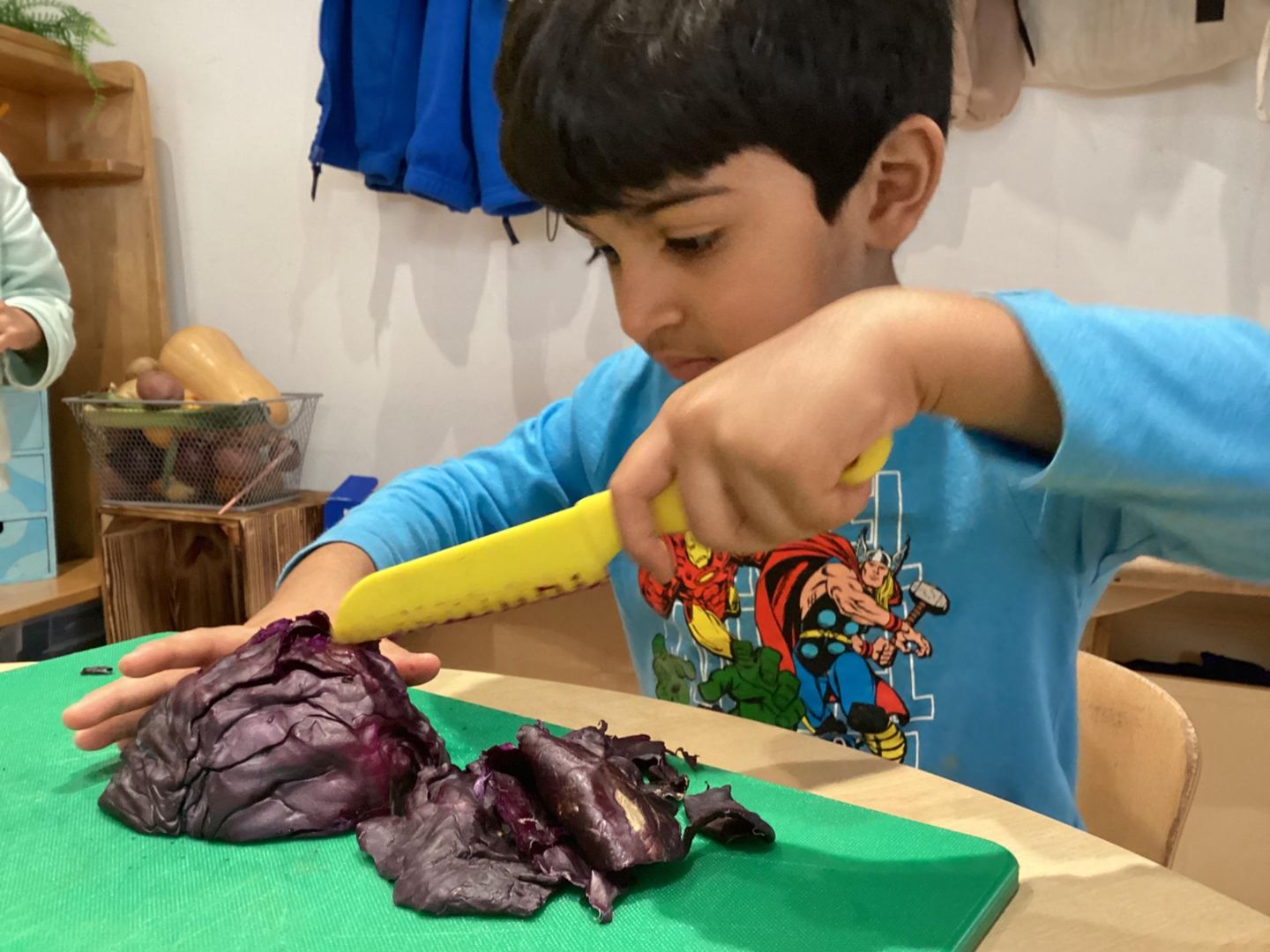 This week, the Blaze class conducted an experiment with red cabbage. To begin, we cut the red cabbage into small pieces and examined the inside. We then placed some of the cabbage into a few pots. In one pot, we added plain water; in another pot, we added vinegar; and in the third pot, we included baking soda.