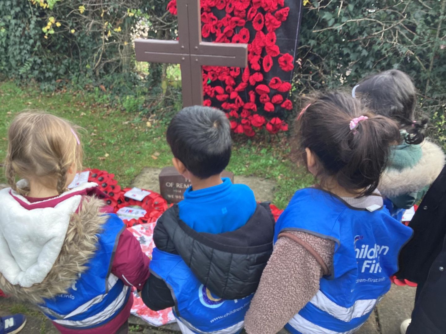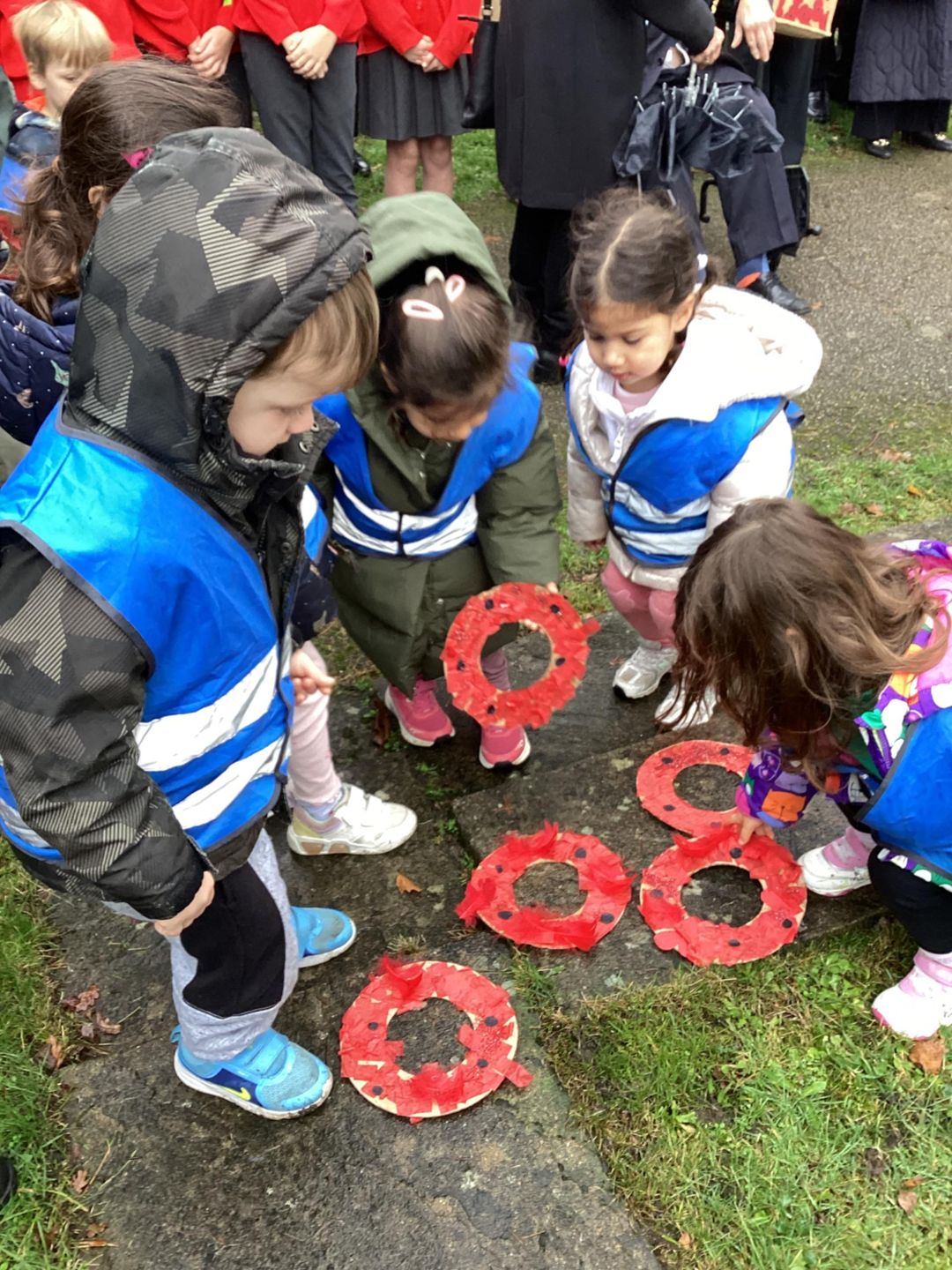Today, the preschool marked Remembrance Day. The children created poppy wreaths and learned about the day's importance. Some of them visited the local memorial at St John's Church, where they saw other schools laying wreaths. At 11 o'clock, we joined together for a two-minute silence to remember and reflect.