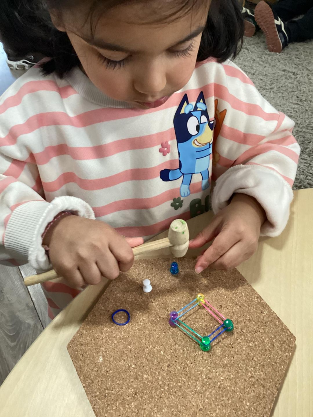 The stars children took part in a exciting risky play activity this morning. Before doing the activity, we spoke to the children about safety. Pins can be dangerous and hurt us and so can hammers, we must be super careful and we must only use this when a adult is with us.