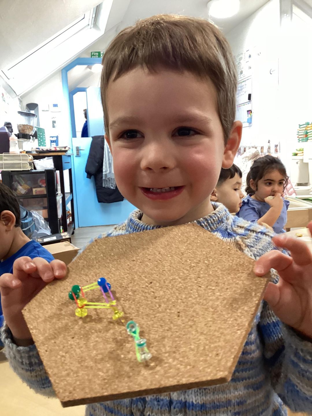 If the children were confident to stretch the bands across the pins, we extended this by encouraging the children to use the pins and the bands to create shapes. The children discovered they could make triangles, squares and rectangles.