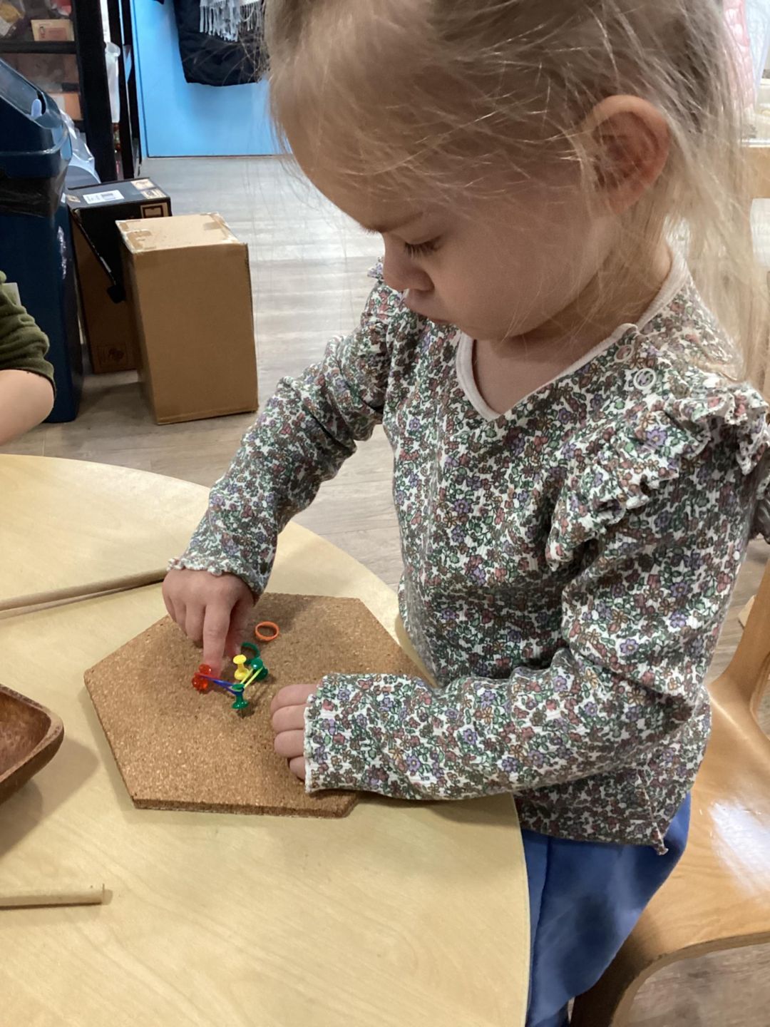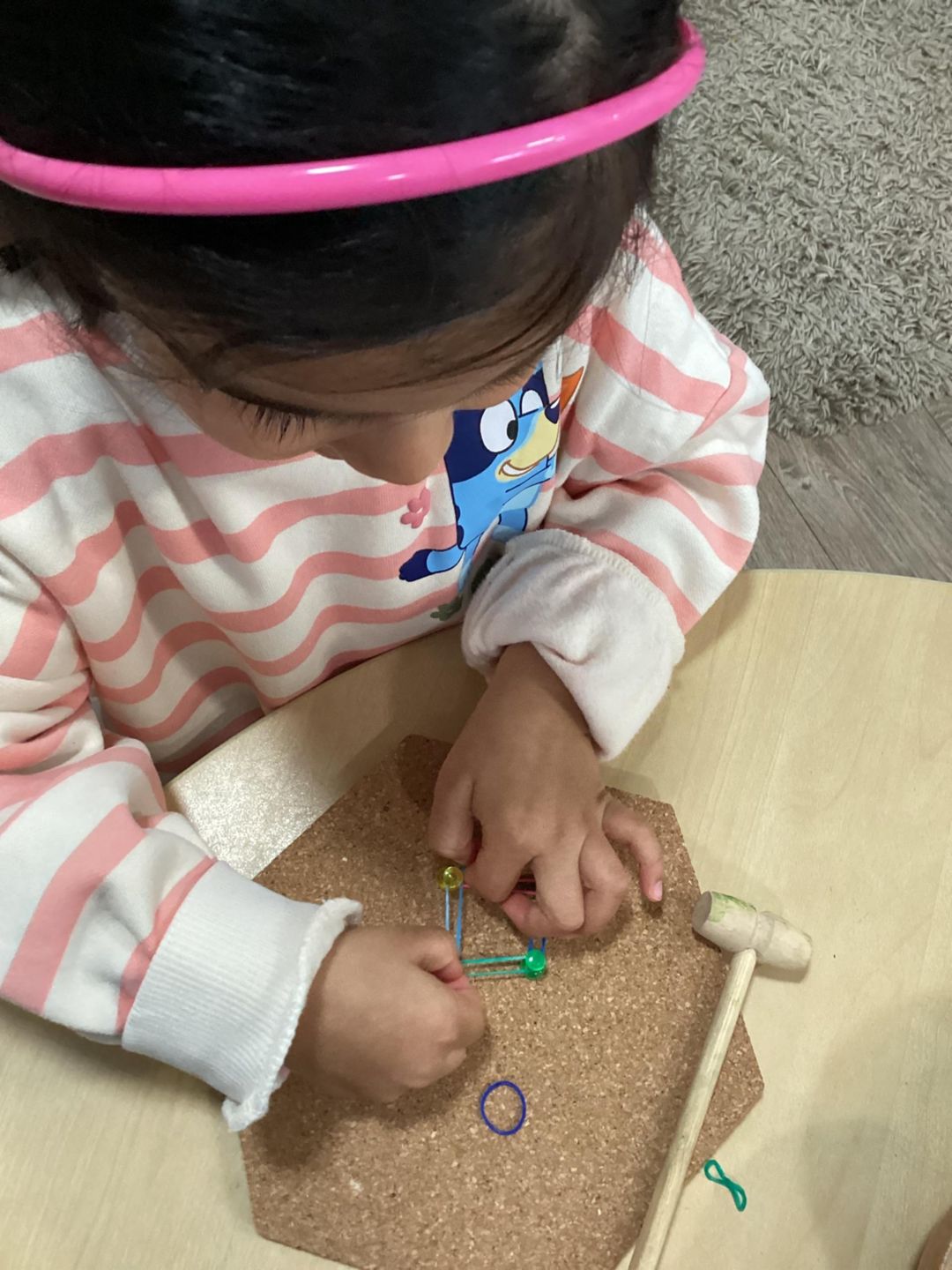 The activity sparked conversation about safety while also focused on their fine motor skills as we hammered the pins into the cork board.