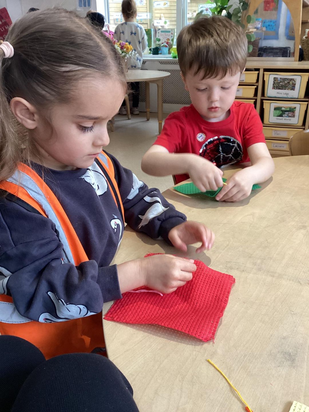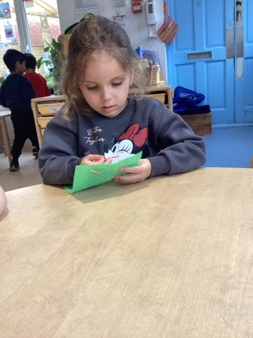 The blaze class participated in a sewing activity this week. Each child selected their own thread and threaded it through a needle. Before Beth tied a knot at the end. Once the knot was secure, we began our sewing. Initially, we found it a bit challenging, but soon we got the hang of it and felt incredibly proud of our completed work. Sewing is immensely beneficial for children as it fosters the development of various skills, including fine motor skills, concentration, and creativity.