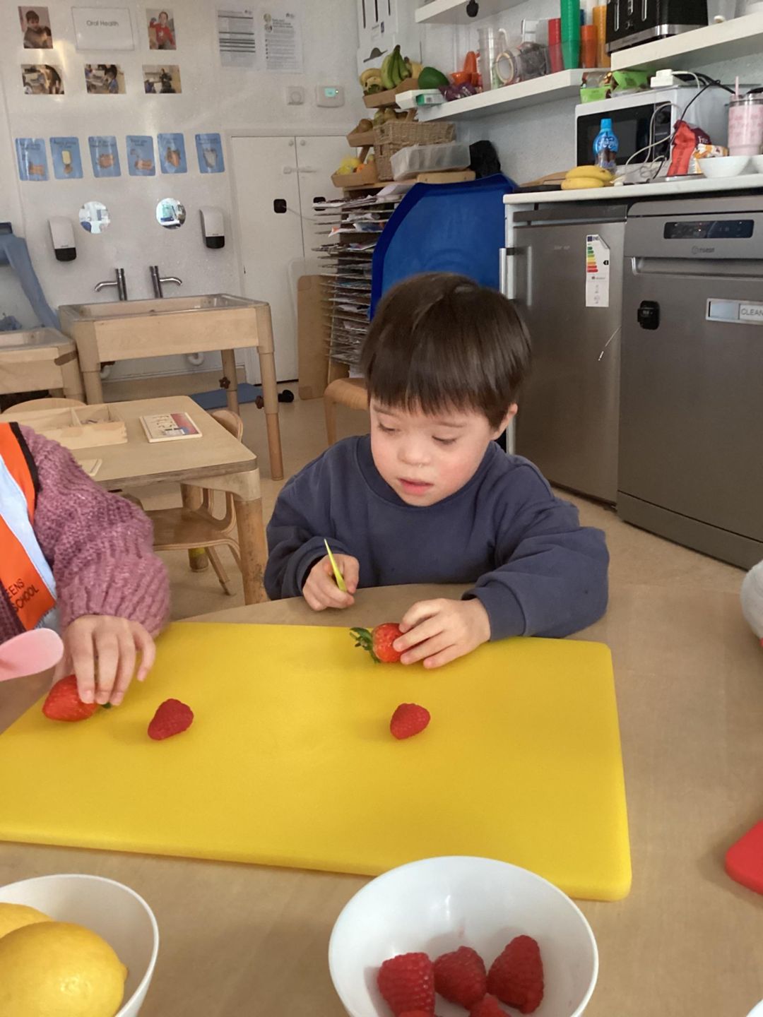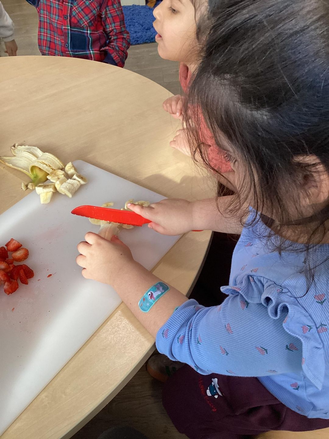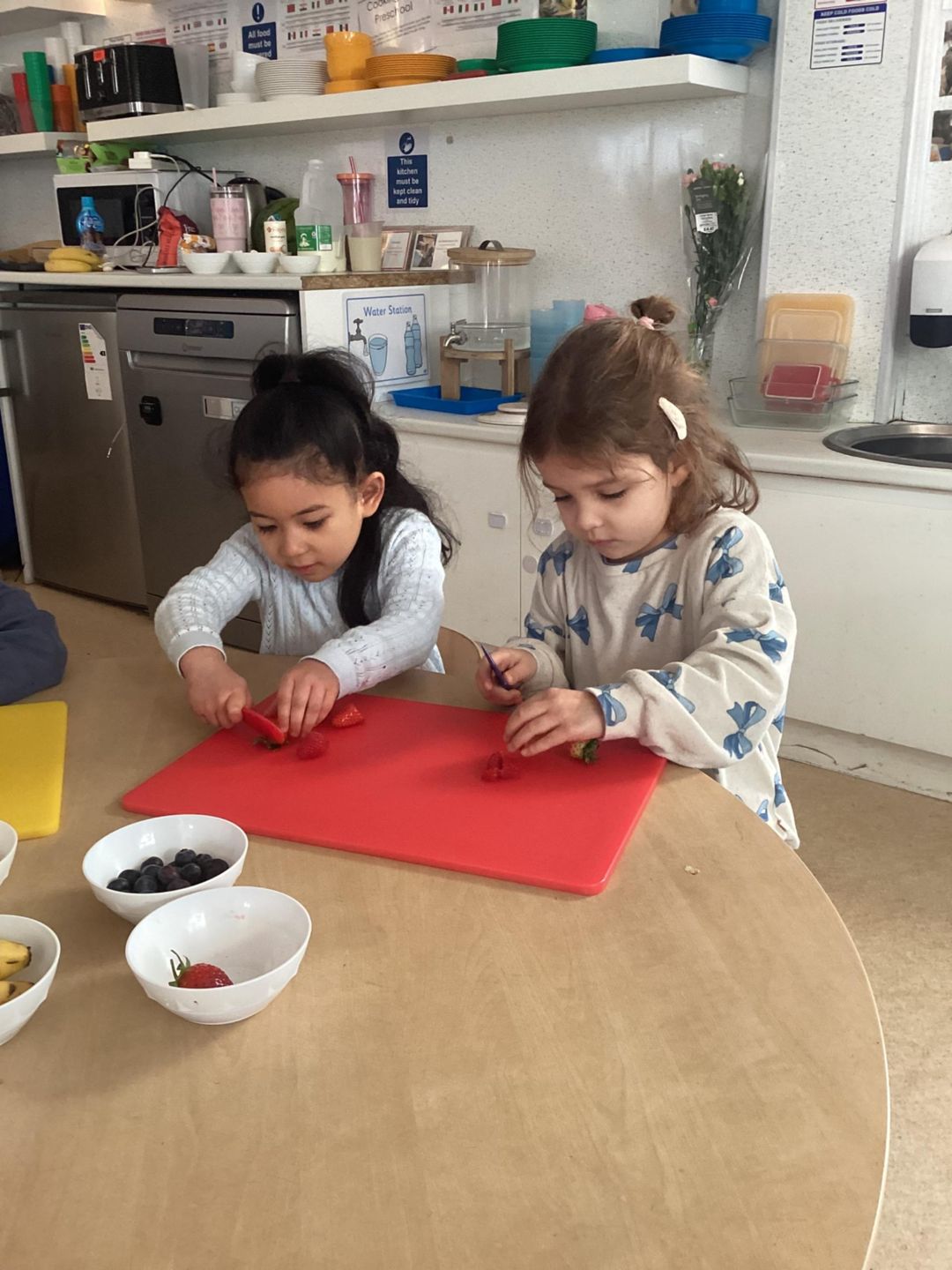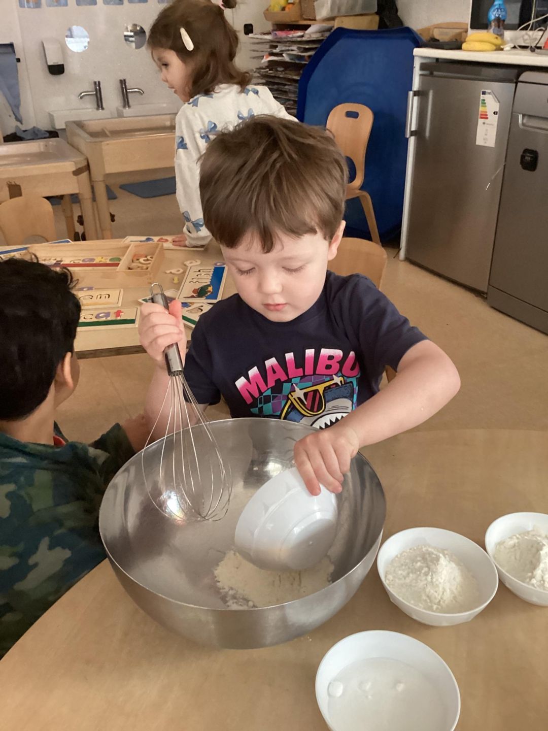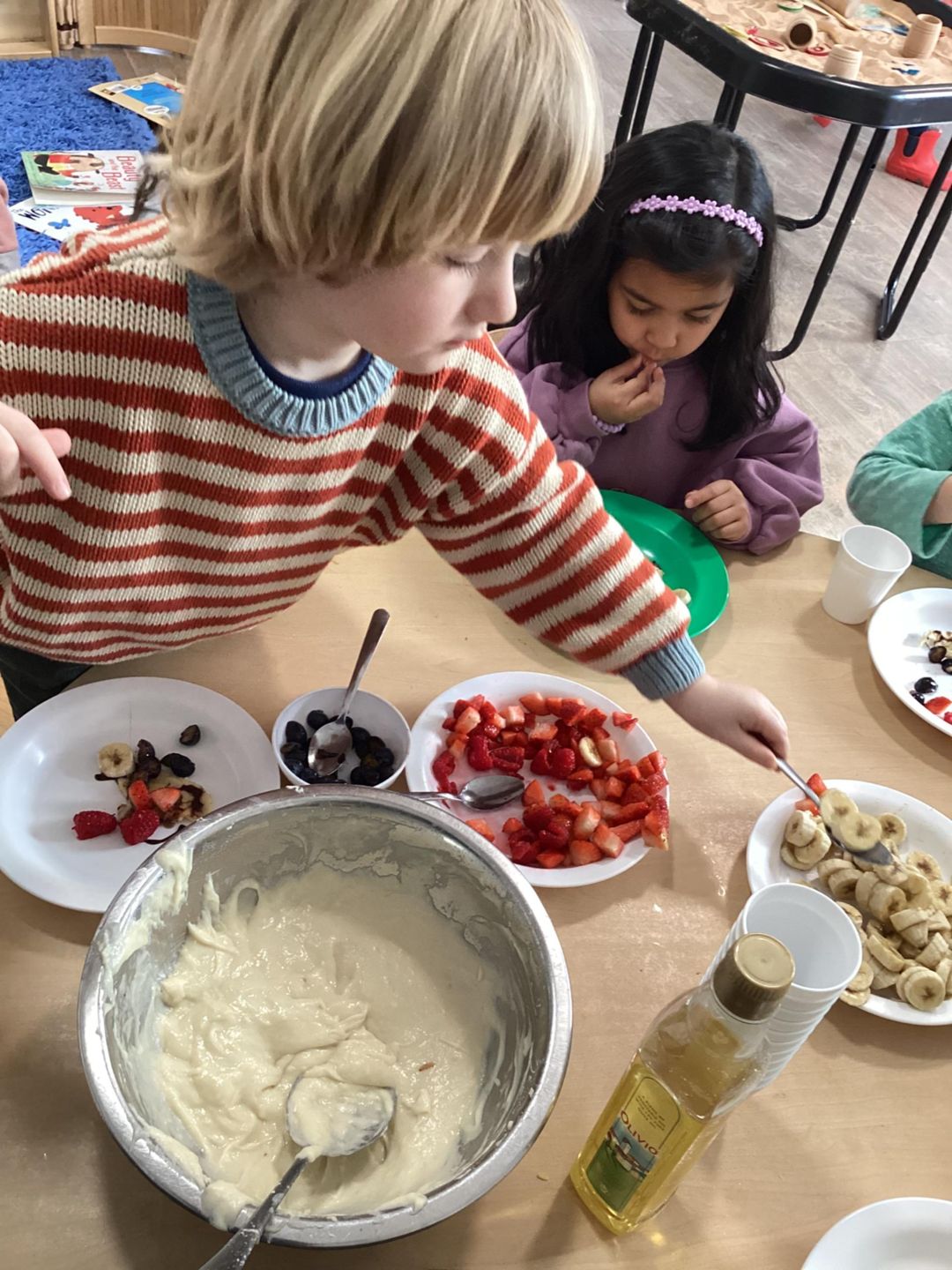 Today the preschool children had a wonderful time celebrating Shrove Tuesday by taking part in a special cooking activity. The children enjoyed adding their own ingredients to the bowl, carefully measuring and pouring before taking turns mixing the batter together. They showed great teamwork and communication skills as they shared utensils and waited patiently for their turn. While stirring and squeezing the mixture, they developed their fine motor skills and hand–eye coordination. The children also learned about safety as they used a knife to cut the up the fruit and helped cook the mixture on a hot stove with adult support. It was a fantastic opportunity to build independence, confidence and early maths skills while celebrating this special day in a fun and meaningful way.