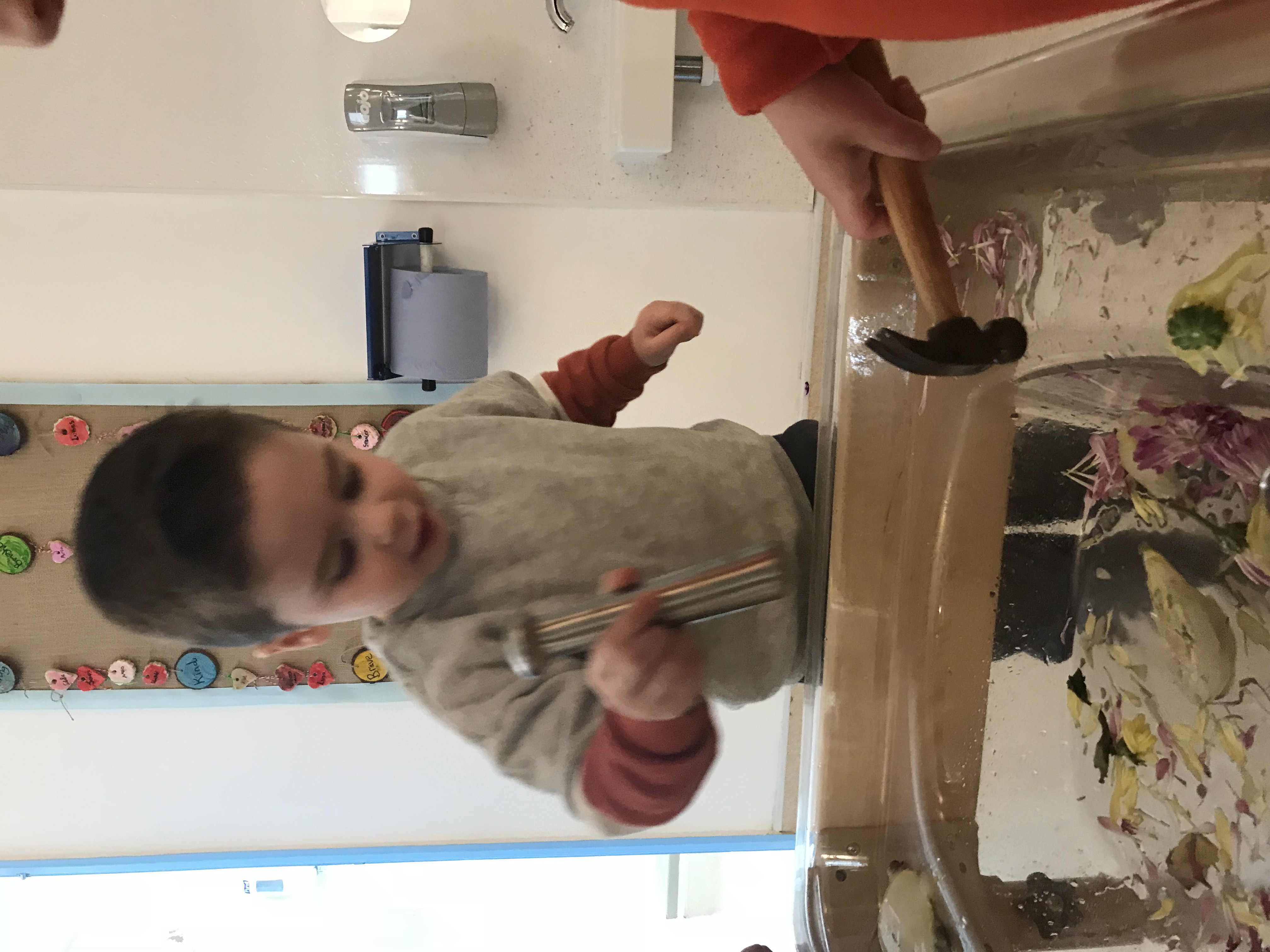 Once the ice was frozen the children used multiple techniques to smash and melt the ice. Warm water was added and the children rubbed their hands on the ice watching as the ice melted an formed water. Risky play materials were also used and the children used tools such as hammers, screwdrivers and mortars to smash the ice open relieving the flowers they trapped inside.