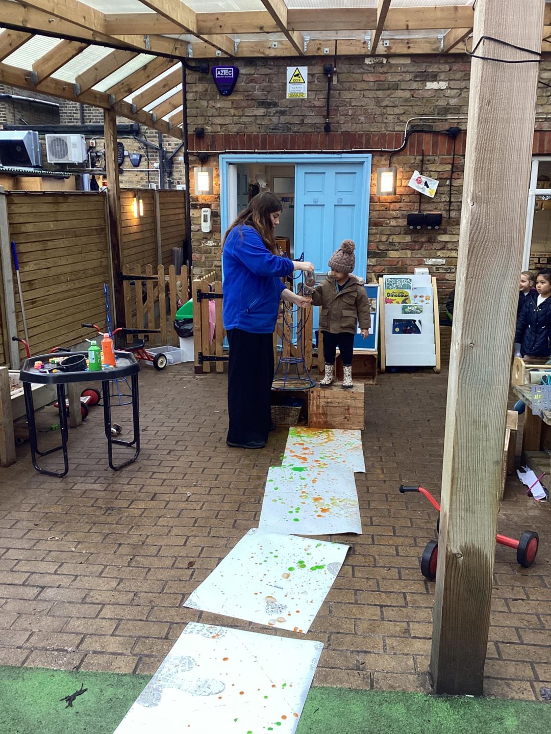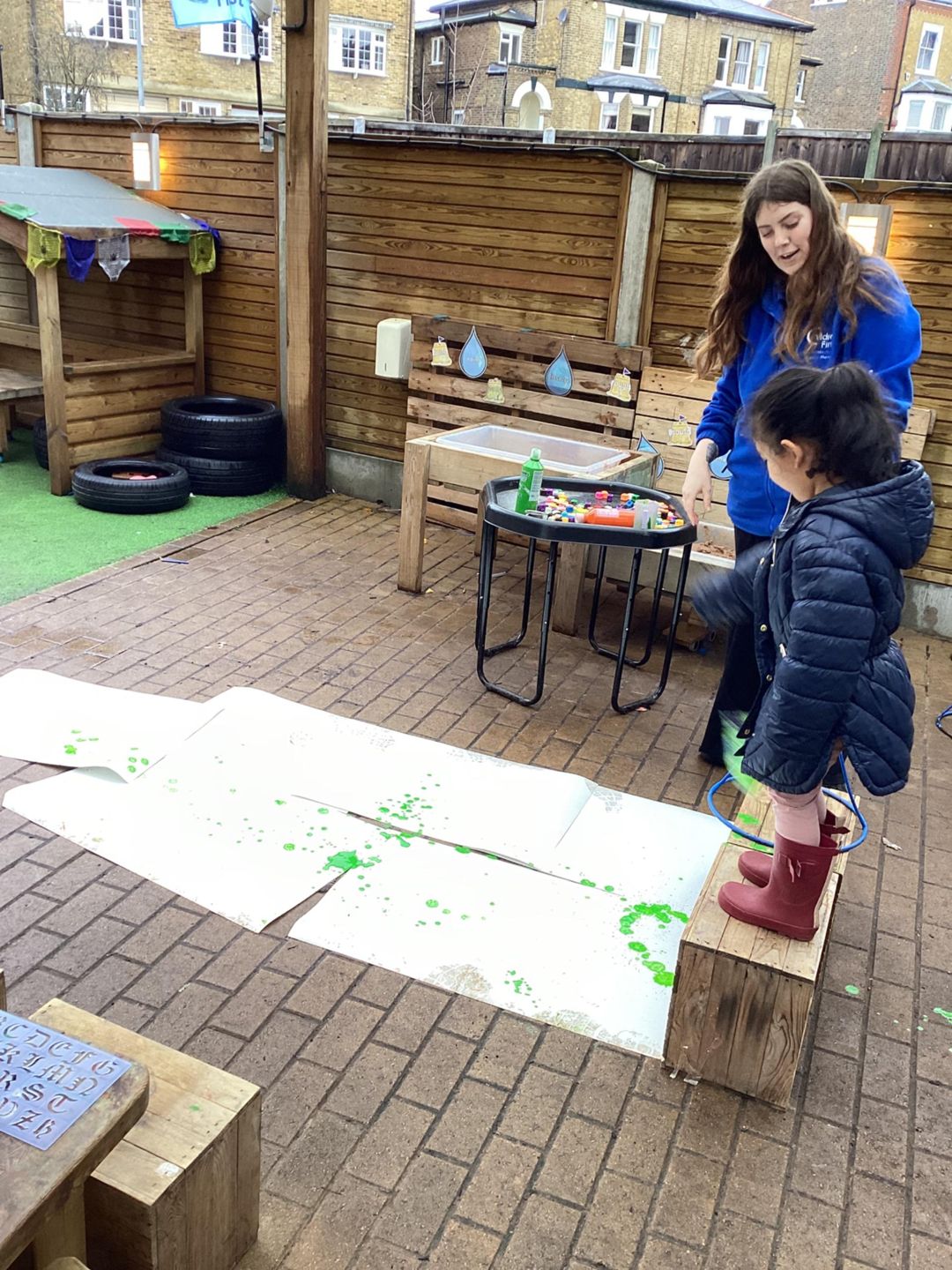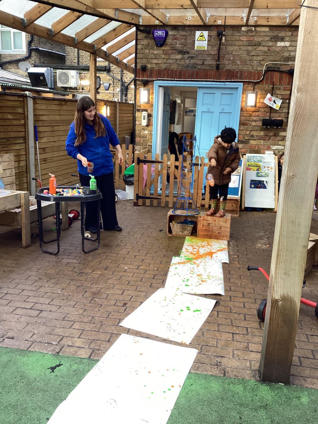 We talked about colours, patterns, and how far the paint travelled, making predictions about whose swing would go the furthest. This activity supported the children’s creativity while also helping to develop their gross motor skills, hand-eye coordination, and turn-taking. The children were very engaged and proud of their colourful artwork.