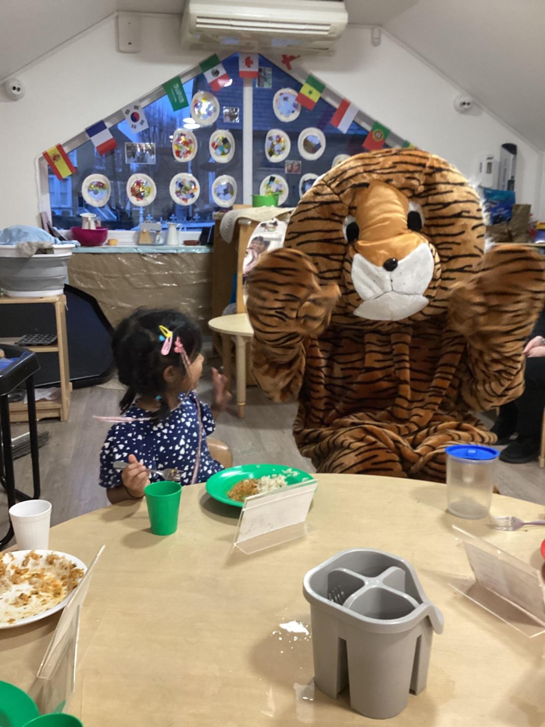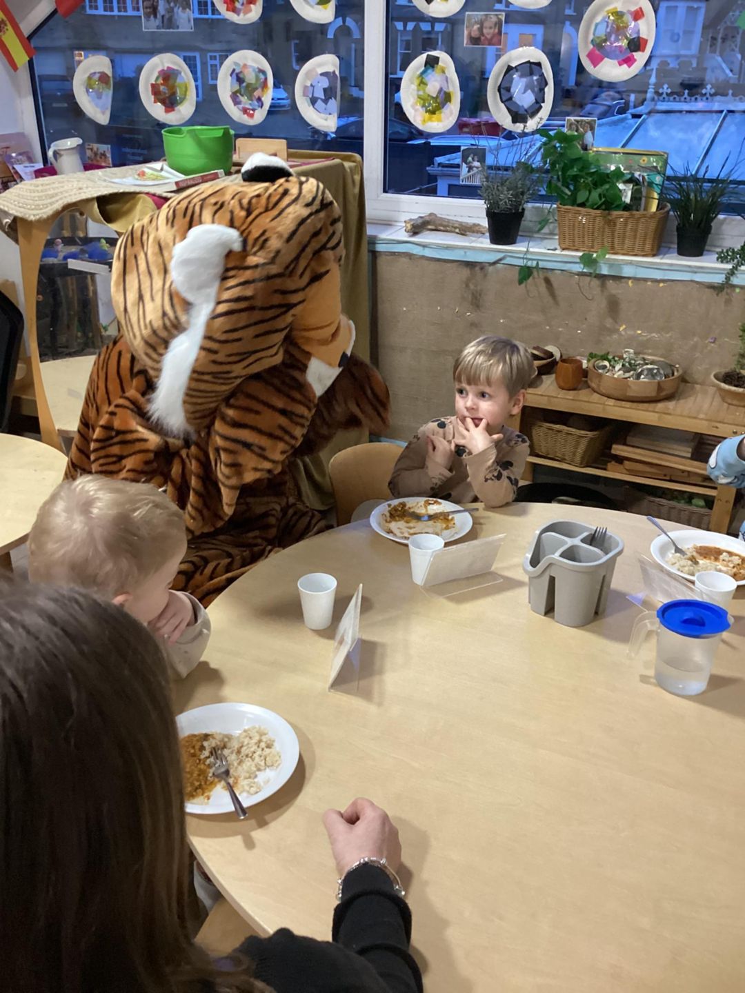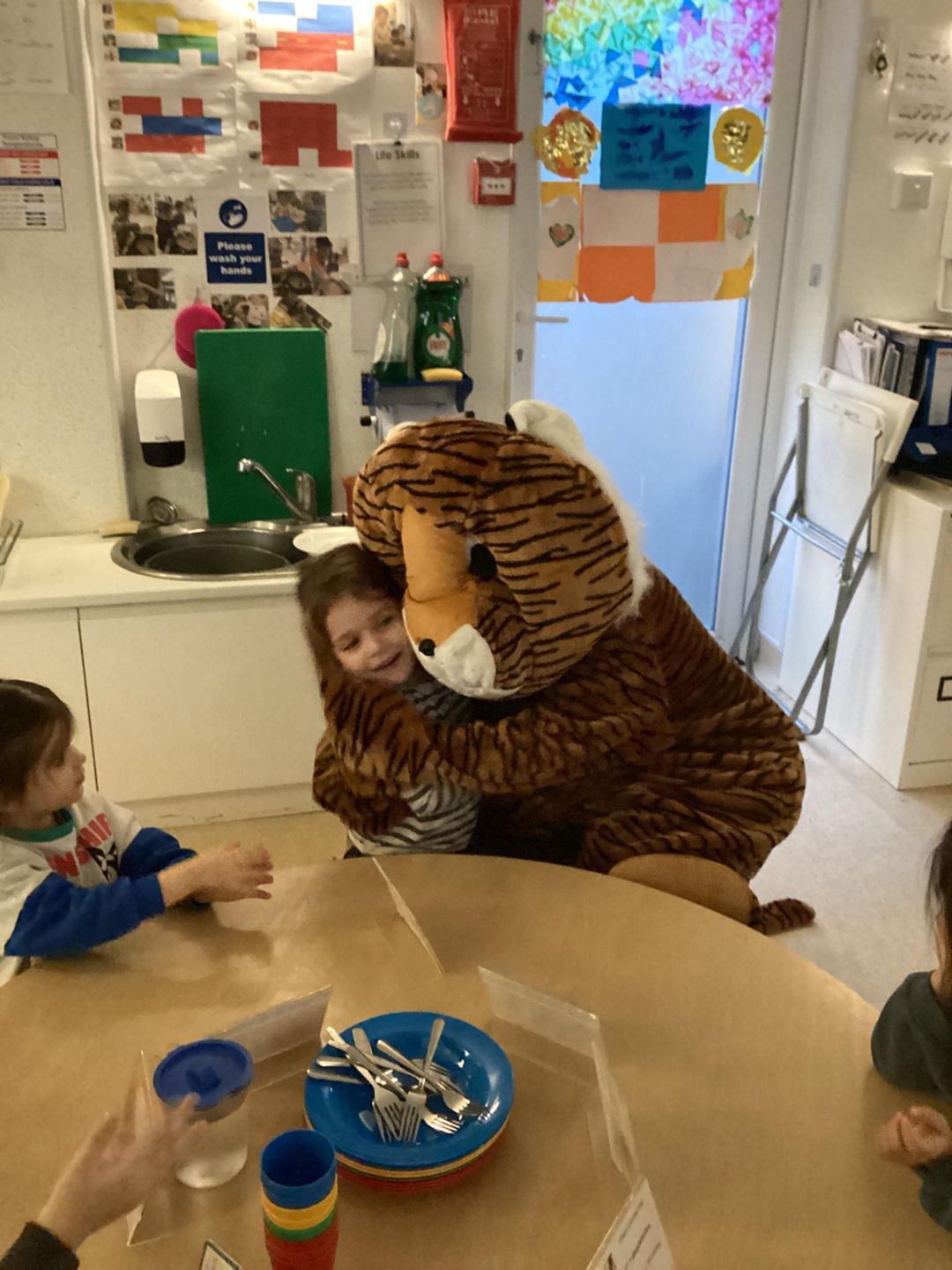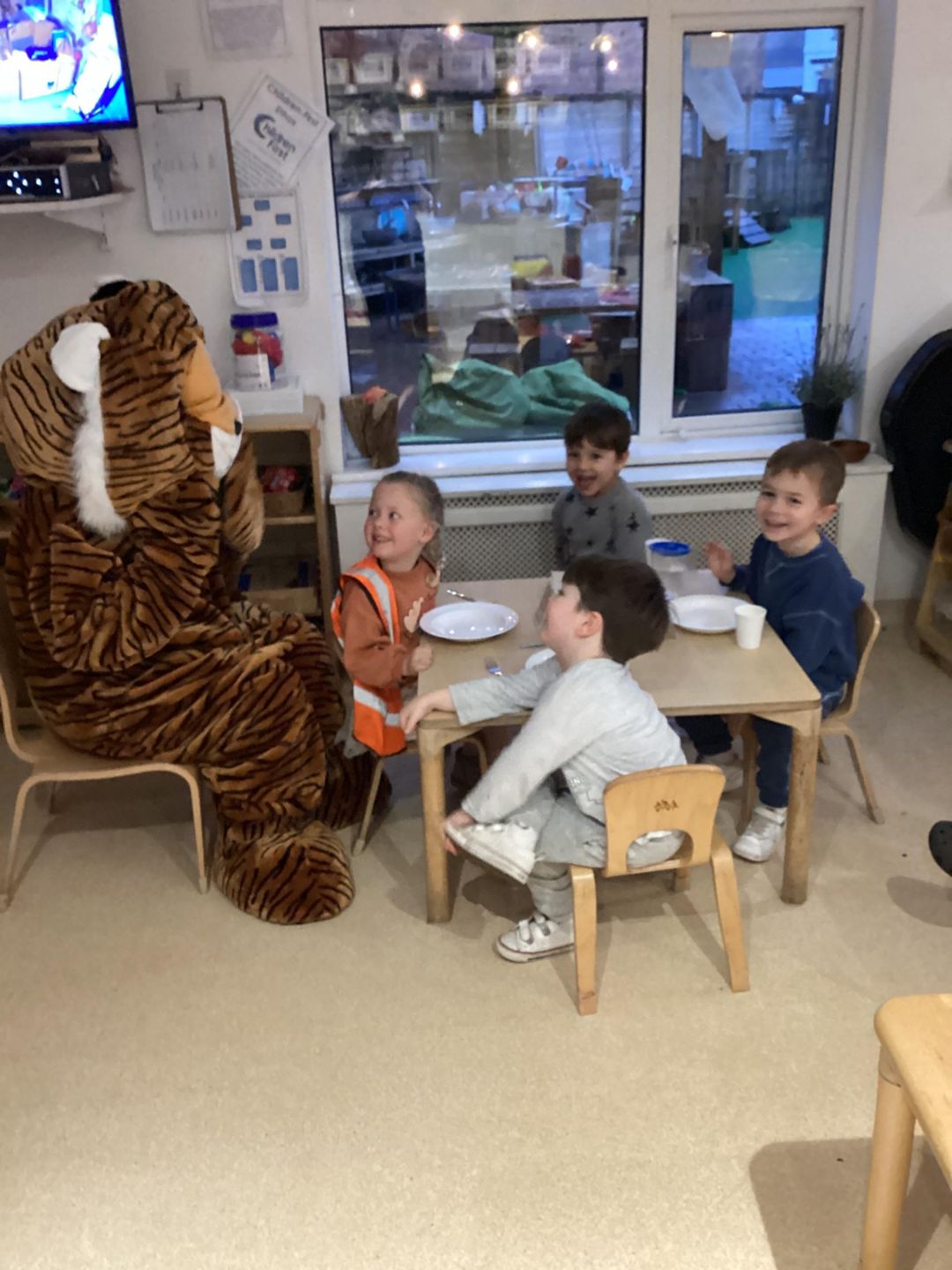 Today, we had a delightful visit from one of our favourite storybook characters, the Tiger Who Came to Tea. Everyone had the chance to give him a cuddle and chat with him about his favorite foods.