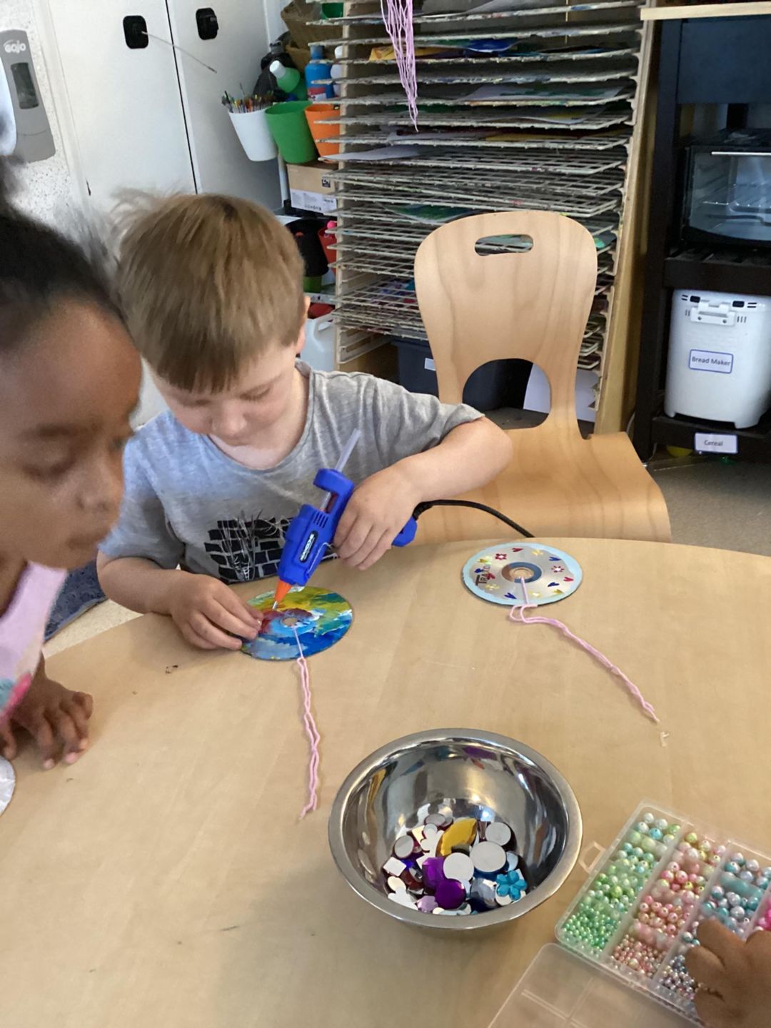 This week, the Horses made wind chimes by painting and decorating CDs. First they started by painting and decorating CDs. They had a conversation about safety when using glue guns. The Horses then used the glue guns to attach pretty beads to their wind chimes. These creations will be displayed in the garden at the well-being hut for everyone to enjoy.